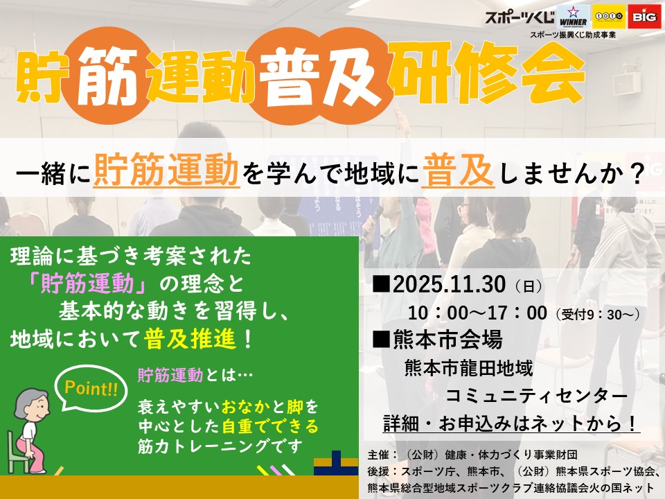 イベント内容 | "●対 象 地域の健康・体力づくりリーダー、運動・スポーツ指導者、スポーツ推進委員、 総合型地域スポーツクラブスタッフ、スポーツ行政担当者 介護予防・介護施設従事者、地域包括支援センタースタッフ、 健康・体力づくり・介護予防行政担当者、老人クラブ連合リーダー、ほか ●内 容 貯筋のすすめ(動画講義) 福永哲夫・鹿屋体育大学元学長/東京大学名誉教授 高齢者の筋力トレーニング、高齢者の教室運営の実際、貯筋運動の基本の動き、ほか ●受講料 5,500円(ハンドブック・普及教材、傷害保険、税込) ≪研修会に関する問い合わせ≫ 公益財団法人健康・体力づくり事業財団 事業部 TEL:03-6430-9114 e-mail:seminar@health-net.or.jp ≪申込≫https://www.health-net.or.jp/kensyu/tyokin/fukyu.html 日常生活を楽にこなしていくために最も大切な太ももやおなかの筋肉は、加齢にともない衰えやすく(老化は脚から!)、50歳以降、年1%減少していきます。筋肉を維持するためには、普通の歩行運動では強度が足りず、日常生活より少し強い刺激(筋トレ)を筋肉に与える必要があります。ウォーキングだけでは、いつか歩けなくなってしまう恐れがあるのです。 「貯筋運動」は、自分の体重を使って行う脚部中心の筋トレなので、いつでも、どこでも、だれでもお金をかけずに行うことができます。毎日10~15分、コツコツ「貯筋」して、生涯動ける体でいられるようにメンテしましょう! ≪貯筋についてもう少し知りたい方はこちらへ≫ (動画)https://www.youtube.com/watch?v=zOdmdhNmwqc (文章)https://www.health-net.or.jp/kensyu/library/pdf/r6_01_004.pdf" |