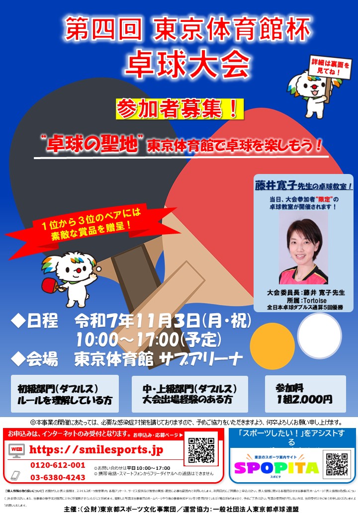 "卓球の聖地" 東京体育館で大会に出場しませんか? 東京2020大会「卓球会場」として使用され、世界のアスリートが熱戦を繰り広げた東京体育館にて卓球大会を開催いたします。 卓球の愛好者のほか、卓球を始めたばかりの方でもルールが分かれば誰でも参加できる大会です。 大会と併せて、当日は参加者限定で「全日本卓球ダブルス通算5回優勝!藤井寛子先生による卓球教室」を開催いたします。 1位から3位のペアには素敵な賞品を贈呈いたします!! ご友人・ご家族と一緒にダブルスを組み是非ご参加ください!
