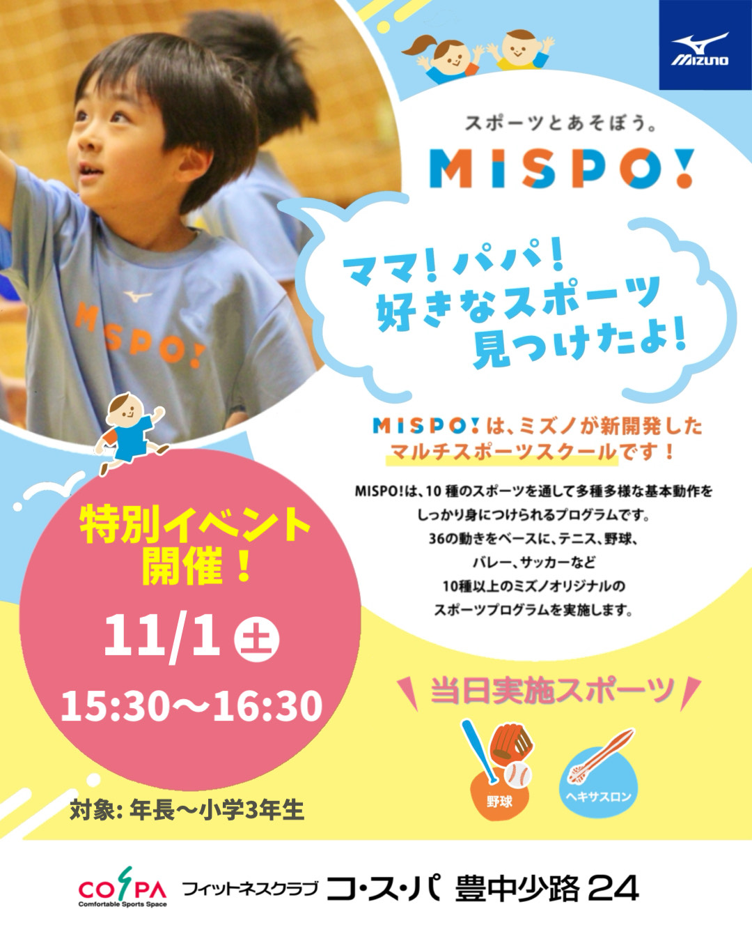 ミズノが開発したお子さま向けマルチスポーツスクール「MISPO!」は、様々なスポーツを楽しみながら、健やかな身体と思考力を育みます。 今回は、人気のMISPO!プログラムを《コ・ス・パ》で体験できる特別イベントを開催! 運動が苦手なお子さまも、これから運動を好きになってほしいお子さまも、どなたでも大歓迎です。 将来につながる“運動の土台づくり”を、今ここから。ぜひお子さまのご参加をお待ちしています!
