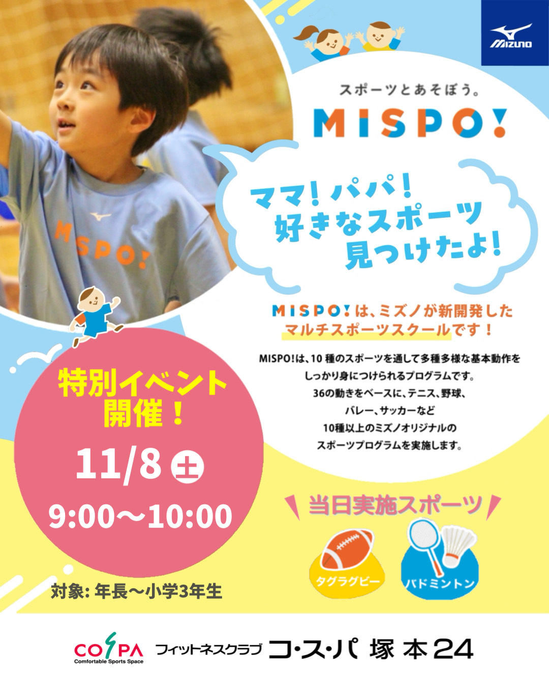ミズノが開発したお子さま向けマルチスポーツスクール「MISPO!」は、様々なスポーツを楽しみながら、健やかな身体と思考力を育みます。 今回は、人気のMISPO!プログラムを《コ・ス・パ》で体験できる特別イベントを開催! 運動が苦手なお子さまも、これから運動を好きになってほしいお子さまも、どなたでも大歓迎です。 将来につながる“運動の土台づくり”を、今ここから。ぜひお子さまのご参加をお待ちしています!