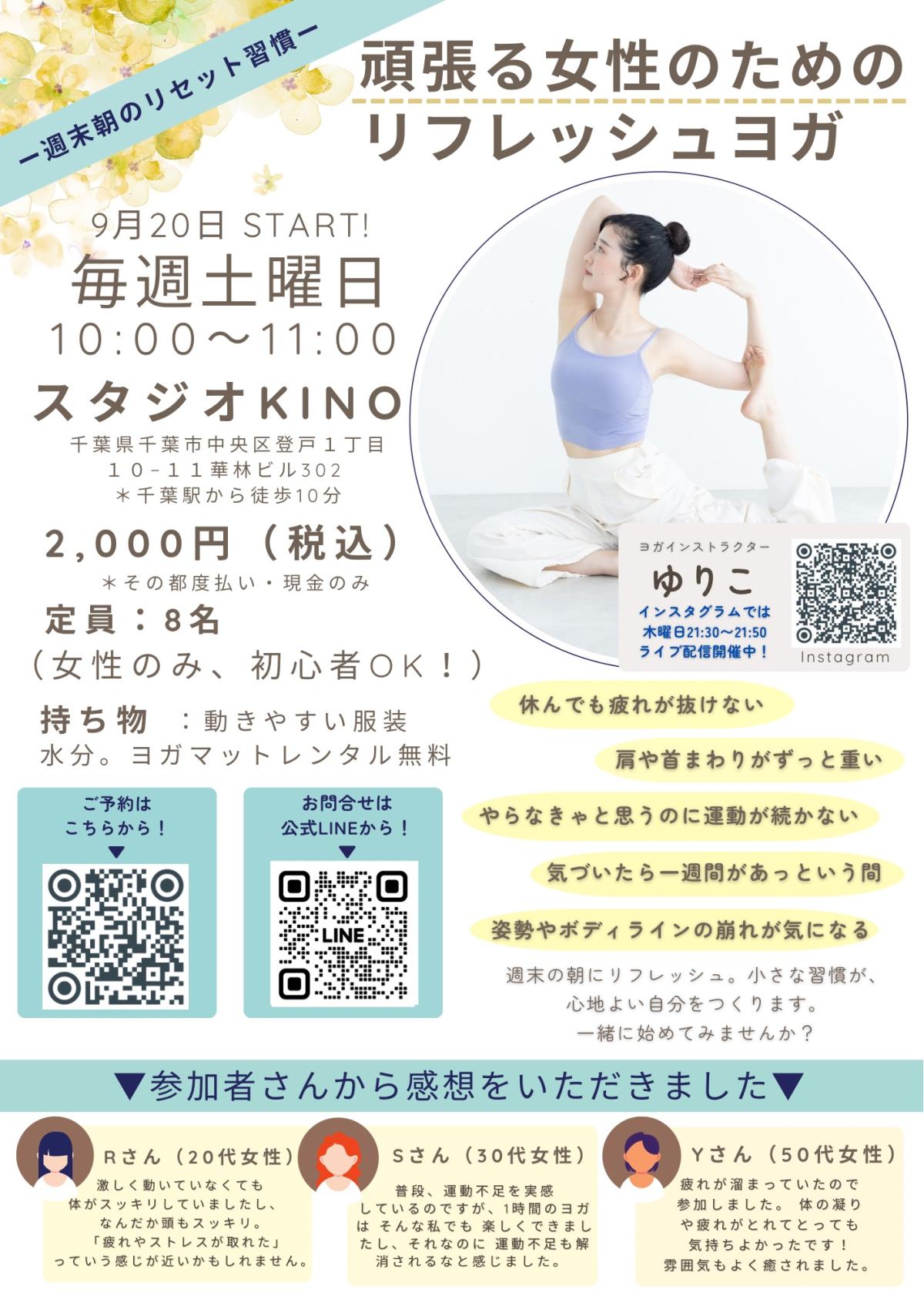 イベント内容 | ●開催日時: 2025年10月11日(土) 2025年10月18日(土) 2025年11月1日(土) ●参加費:1レッスン2000円 (6回目は半額です★) 終わったあとは… ・首や肩の重さがラクになる ・呼吸が深まって心が落ち着く ・背すじがスッと整う ・週末が前向きにスタートできる “週一のリセット習慣”で、心も体もすこしずつ整えていきましょう ●講師:ゆりこ こんにちは!ヨガインストラクターのゆりこです 普段は『千葉の少人数制スタジオ』を拠点に活動しています。 少人数だからこそ、生徒さんのその日の心や体の状態に寄り添いながら、レッスンを一緒に作っていけることが魅力だなと感じています。 東京ではヨガイベントの企画や開催もしていて、スタジオを飛び出していろんな人がつながる場をもてることが嬉しいです✨ そんな私ですが、実はもともと体も硬くて、運動もあまり得意ではありませんでした。 でも、続けるうちに少しずつ体が変わってきて、 心も前向きになっていくのを感じました。 そんな感覚に出会って、「もっと知りたい」「誰かに伝えたい」と思うようになりました。 私がヨガで大事にしているのは、 “今の自分にそっと目を向けていくこと” “少しずつ積み重ねていくこと” 自分の呼吸や体の感覚に意識を向けたり、一歩離れたところから観察してみると、思ってもみなかったクセに気づいたり、普段はスルーしている感覚と出会えたりします。 レッスンでは、「がんばりすぎず、でもあきらめでもなく」 ちょうどいい心地よさで、自分とつながる時間を大切にしています。 小さな積み重ねが 前に進む力を育ててくれると感じています。 ポーズや呼吸から生まれる、小さな気づきや発見を、 みなさんと一緒に味わえたら嬉しいです instagram/yuriko_yoga31 |