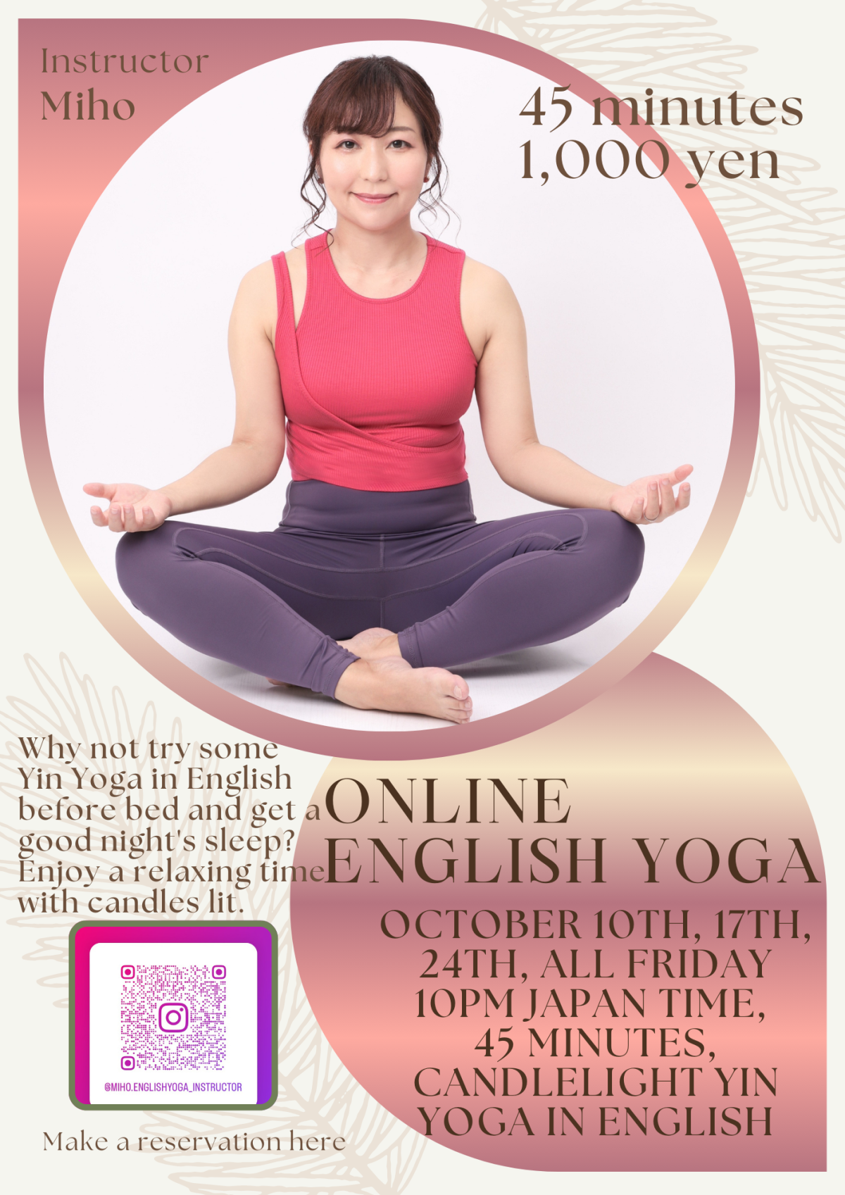 イベント内容 | ●開催日時: 10/10(金)22:00–22:45 JST 10/17(金)22:00–22:45 JST 10/24(金)22:00–22:45 JST ●講師:MIHO|英語ヨガインストラクター オンラインで“英語×陰ヨガ”を提供。やさしい英語とジェスチャーで、初心者でも安心して参加できるクラスづくりを心がけています。 English-friendly Yin teacher based in Tokyo—gentle cues, calm pace, welcoming for beginners. Instagram:[@miho_englishyoga_instructor] |