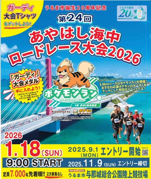 海と空が生み出す感動のあやはし 3.8kmコースはポケモンランを開催! おきなわ応援ポケモンのガーディをテーマにした特別なイベントだよ! ガーディ大会Tシャツ・大会メダルを手に入れよう! これまで3月に開催していましたが、第24回大会(2026年)より1月開催となりました。 第24回大会(2026年)は、3.8kmのコースで 日本初開催 の ポケモンラン を開催します! おきなわ応援ポケモンのガーディをテーマにした特別なイベントとなります! 360度エメラルドグリーンの海に囲まれた「海中道路」で、ハーフマラソン・10kmマラソン・ポケモンラン(3.8km)を楽しみませんか?