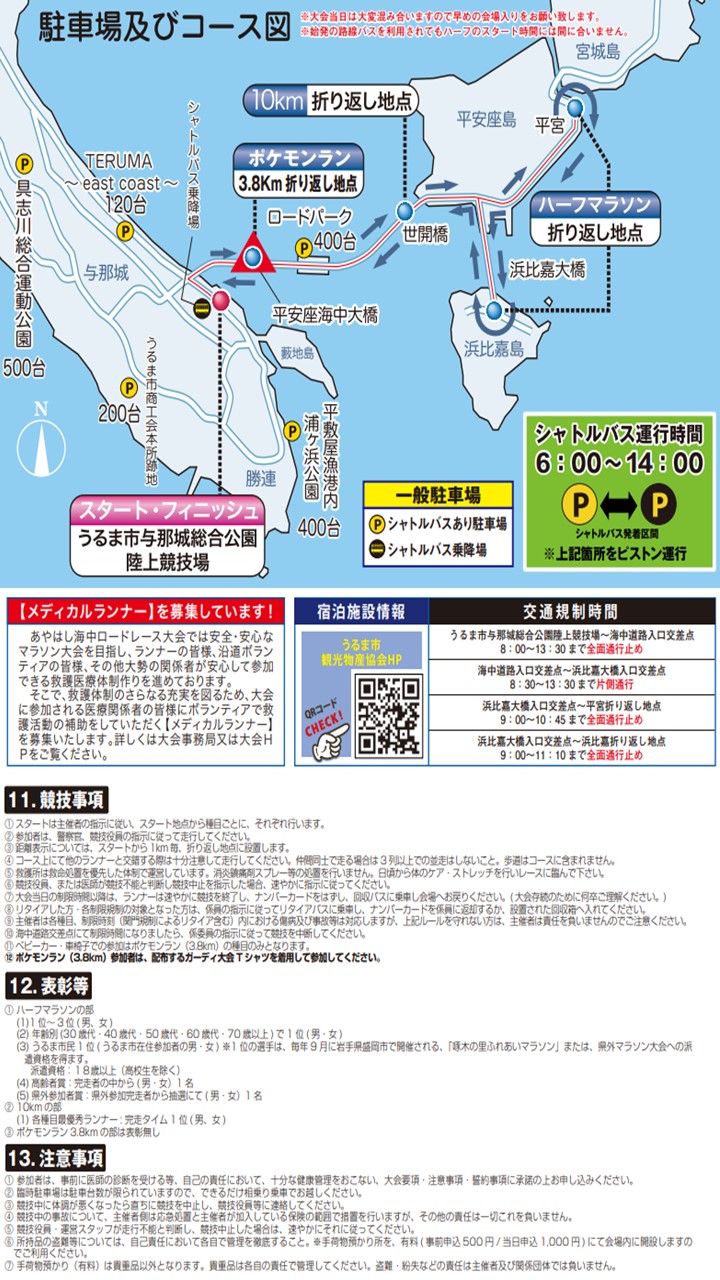 | イベント内容 | ※R7年10月15日現在、エントリーが3,000名を超えました 例年に比べ早いペースで参加者が増えております。申込締切は、11月9日(日)です。申し込みはお早めに! ●開催日;2026年1月18日(日)開催 ※雨天決行・荒天中止 ●定員 [ハーフ]2900人 [10km]1200人 [ポケモンラン(3.8km)]2900人 ※申し込み期間中でも定員に達し次第、締め切りとなります。 ●記録計測:あり ●参加賞:ガーディ大会Tシャツ・ドリンク ●完走証:あり ●表彰: [ハーフマラソンの部] (1)1位~3位(男、女) (2)年齢別(30歳代・40歳代・50歳代・60歳代・70歳以上)で1位(男・女) (3)うるま市民1位(うるま市在住参加者の男・女) ※1位の選手は、毎年9月に岩手県盛岡市で開催される、「啄木の里ふれあいマラソン」または県外マラソンへ派遣します。(旅費等は事務局負担、参加資格18歳以上(高校生を除く)) (4)高齢者賞:完走者全員の中から(男・女)1名 (5)県外参加者賞:県外参加完走者から抽選にて(男・女)1名 [10km]各種目最優秀ランナー:完走タイム1位(男、女) [ポケモンラン3.8kmの部]表彰無し ●スケジュール 当日 6:30~8:30 ナンバーカード引換(ハーフマラソン) 6:30~9:20 ナンバーカード引換(10km) 8:00 開会式 9:00 スタート(ハーフマラソン) 9:50 スタート(10km) 10:00~11:40 ナンバーカード引換(ポケモンラン3.8km) 11:30 表彰式(ハーフマラソン) 11:50 表彰式(10km) 12:10 スタート(ポケモンラン3.8km) 13:30 表彰式(ポケモンラン3.8km) ※閉会式の実施なし ●参加費 ハーフ:6000円他(定員2,900人) 10㎞ :5000円他(定員1,200人) 3.8㎞ :4000円他(定員2,900人) ◆ポケモンランとは 2016年に台湾で実施以降、アジアの各地で定期的に開催されているランイベントです♪ ポケモンTシャツなど共通のアイテムをみんなで身に着けて走り、大会メダルをゲットすることも可能! 親子2~3世代で参加できる世代を超えて楽しめる企画となっています! ※ポケモンランのスタート前にお楽しみコンテンツを企画しています! 詳細は、大会HPにて随時更新します。 ・ポケモンラン(3.8km)の参加者は、有料(+2,000円)で完走賞のおきなわ応援ポケモンガーディ大会メダルを申し込むことができます。 ・ポケモンラン(3.8km)の参加者は計測がなし。別途、有料(+700円)で計測が出来ます ※申し込みの際にオプションを追加してください。 後日・当日の追加はできません。 ◆お申込み方法 1.インターネットエントリー お申込はこちら↓ スポーツエントリーあやはし海中ロードレース申し込みページ https://www.sportsentry.ne.jp/event/t/102050 *団体割引は、インターネットエントリーのみの適用となります。 4人以上同時にインターネットによる申込で1人当たり500円の割引きとなります。 2.スーパースポーツゼビオ(うるま店・宜野湾店・イーアス沖縄豊崎店) 3.あやはし海中ロードレース大会事務局(うるま市与那城中央1)10月15日より受付開始 *受付時間:午前10時00分~午後4時00分 ●ガーディ大会メダル(有料オプション)デザイン 近日公開予定。お楽しみに! ーーーーーーーーーーーーーーーー お問合せ先 あやはし海中ロードレースコールセンター 0120-711-951 (フリーダイヤル)(受付時間:午前10時~午後5時) 2025年9月1日(月曜日)~2026年1月16日(金曜日)営業日:土日祝日除く kankousports-ka@city.uruma.lg.jp 【大会前日・当日のお問い合わせ】 あやはし海中ロードレース大会事務局 TEL:098-978-9404 対応時間:10:00~16:00 |