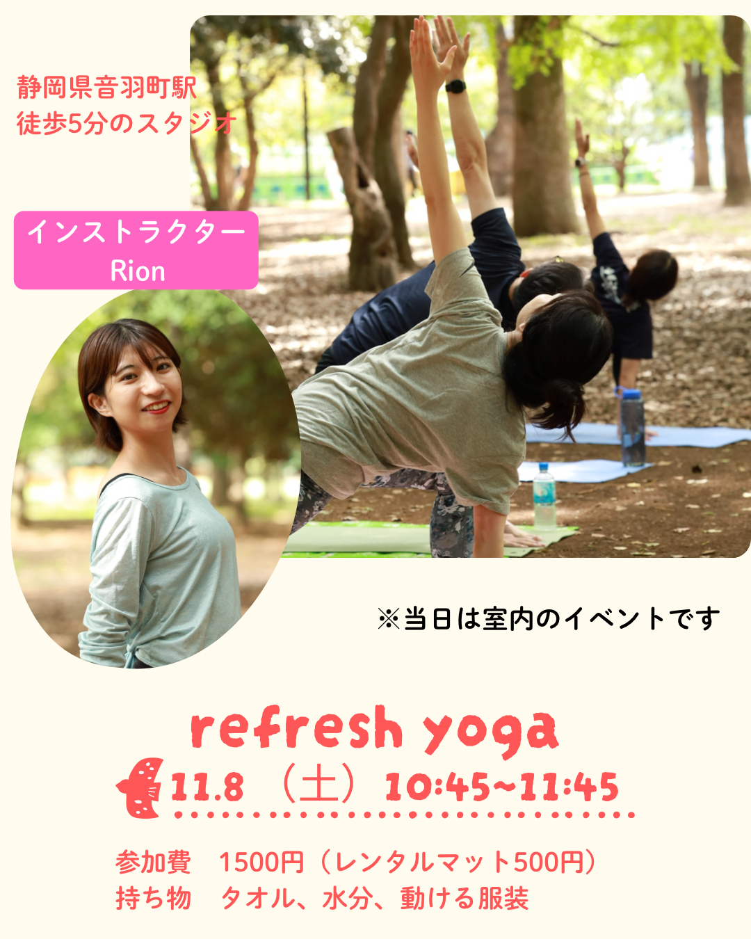 | イベント内容 | 10:30 ドアオープン 10:45〜11:45 ヨガ 12:00 解散 ●参加費:1500円 レンタルマット500円 ●講師:Rion 柔道整復師として整形外科に勤務しながらヨガの活動をしております。 他にも、アスレティックトレーナー、健康運動指導士の資格を保有しており様々な年代の方に対する健康づくりに関わっています 健康を維持する上で、身体だけでなく心が健康であることの大切さを日々感じており ヨガを通して心身の健康を伝えていければと思い活動しております。 イベントを通じてお会いできるご縁に感謝し、楽しんでもらえる時間をお約束します♪ |