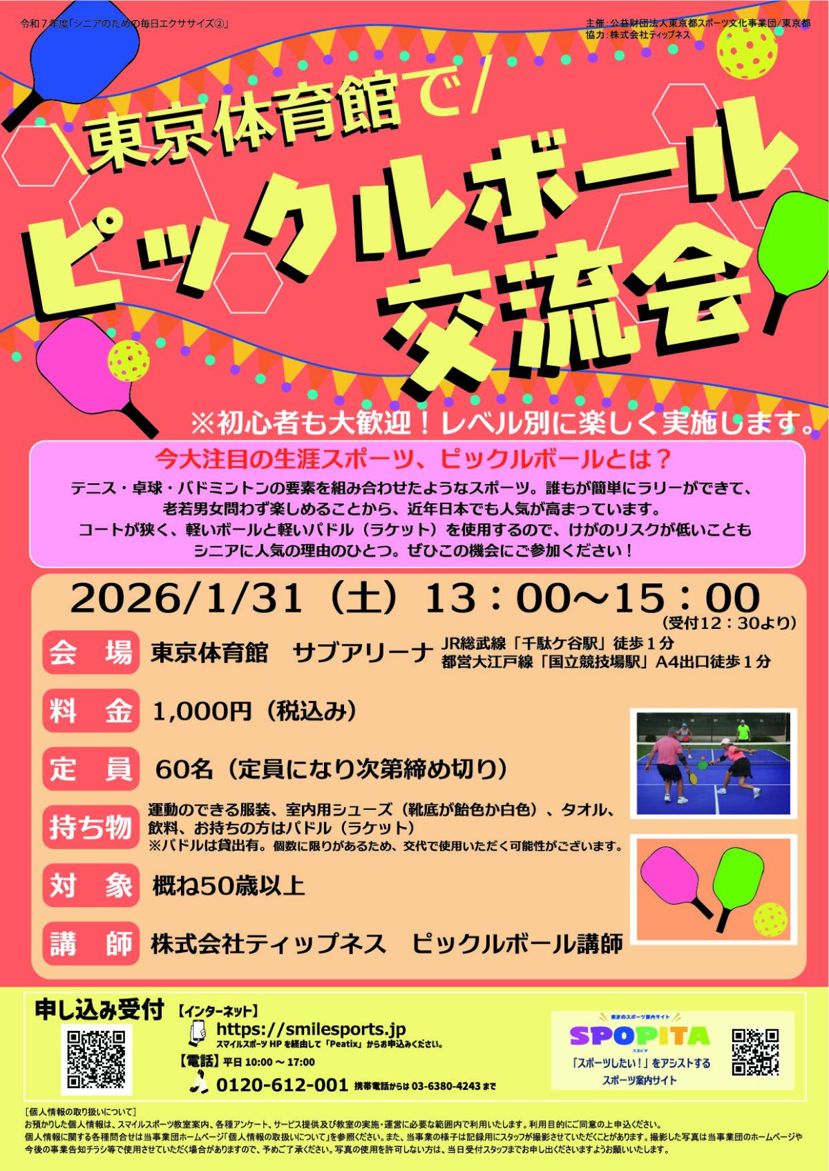 いま話題のピックルボールを、東京体育館で体験してみませんか? ピックルボールとは、テニス・卓球・バドミントンの要素を組み合わせたようなスポーツ。誰もが簡単にラリーができて、老若男女問わず楽しめることから、近年日本でも人気が高まっています。 コートが狭く、けがのリスクも低いことも、シニアに人気の理由のひとつ。レベルに合わせて教えてもらえるチャンスなので、初心者の方もぜひこの機会にお申込みください!