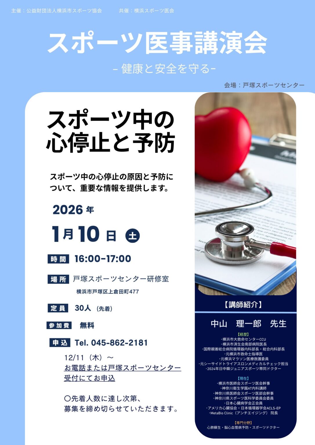 横浜スポーツ医会のスポーツドクターによるスポーツ医事講演会を開催します。 貴重なお話を無料で聞くことができる機会なので、ぜひご参加ください。