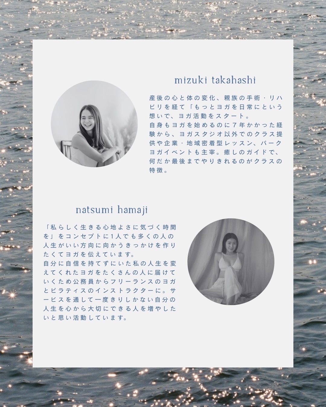 | イベント内容 | 10:30-11:30 フローヨガ+ピラティスで心と体の軸をみつけ、後半はゆるむまどろみのヨガへ。ヨガ後は、ここだけで出会えるオリジナルカードを使って、自分の気持ちをふっと言葉にしていく時間を一緒に過ごしましょう。 ●参加費:5,500円(当日現金お支払い) ※ヨガマット、1ドリンク付 ●講師:Natsumi /高橋みづき Natsumi 「私らしく生きる心地よさに気づく時間を」をコンセプトに1人でも多くの人の人生がいい方向に向かうきっかけを作りたくてヨガを伝えています。自分に自信を持てずにいた私の人生を変えてくれたヨガをたくさんの人に届けていくため公務員からフリーランスヨガとピラティスインストラクターに。サービスを通して一度きりしかない自分の人生を心から大切にできる人を増やしたいと思い活動しています。 インスタグラム:(@natsu_une) https://www.instagram.com/natsu_une/ 高橋みづき 産後の心と体の変化、親族の手術・リハビリを経て「もっとヨガを日常に」という思いで、ヨガ講師活動をスタート。自身もヨガを始めるのに7年かかった経験から、ヨガスタジオ以外でのクラスを提供。企業・地域密着型レッスン、パークヨガイベントも主催。癒しのガイドでなんだか最後までやりきれるのがクラスの特徴。 インスタグラム:(@miiiiyoga) https://www.instagram.com/miiiiyoga/ |