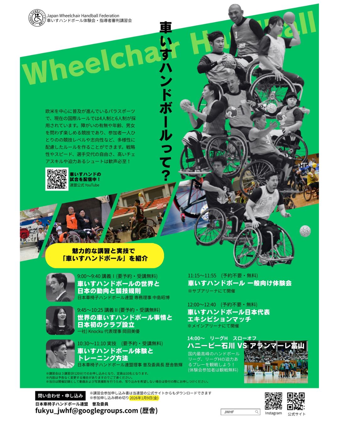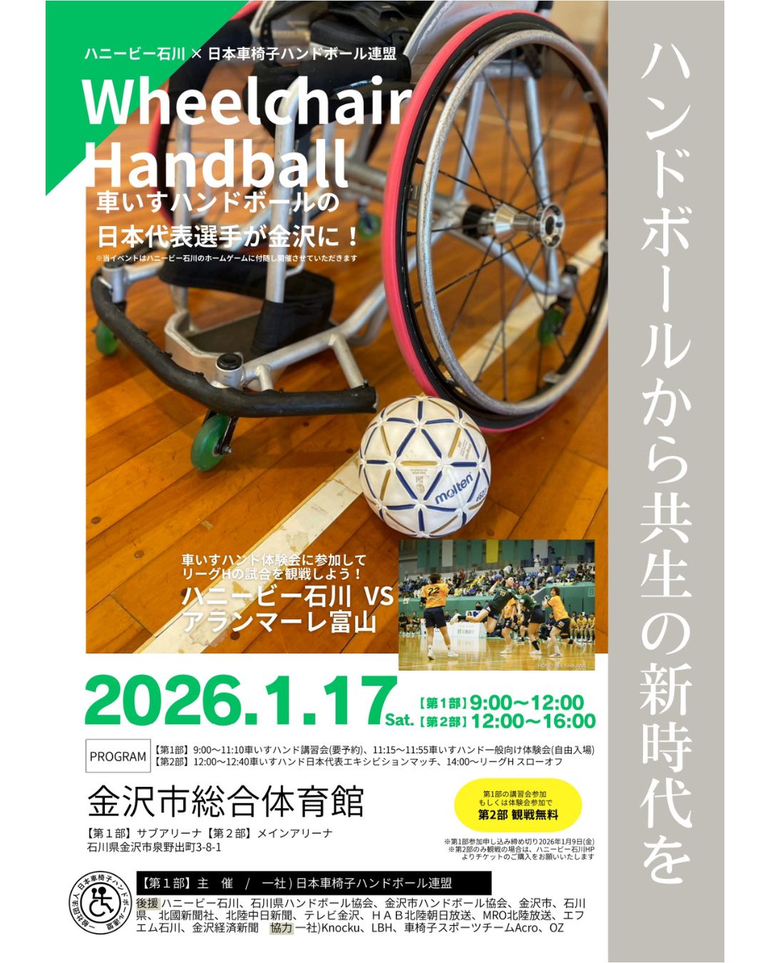 | イベント内容 | 【第1部】 09:00~09:40 講義Ⅰ 09:45~10:25 講義Ⅱ 10:30~11:10 実技 11:15~11:55 一般向け体験会 ▶講習会予約は日本車椅子ハンドボール連盟公式サイトより(定員10名) https://jwhf.jp/ 【第2部】 12:00~12:40 車いすハンドボール日本代表エキシビジョンマッチ 14:00~15:30 リーグH ハニ―ビー石川×アランマーレ富山 |