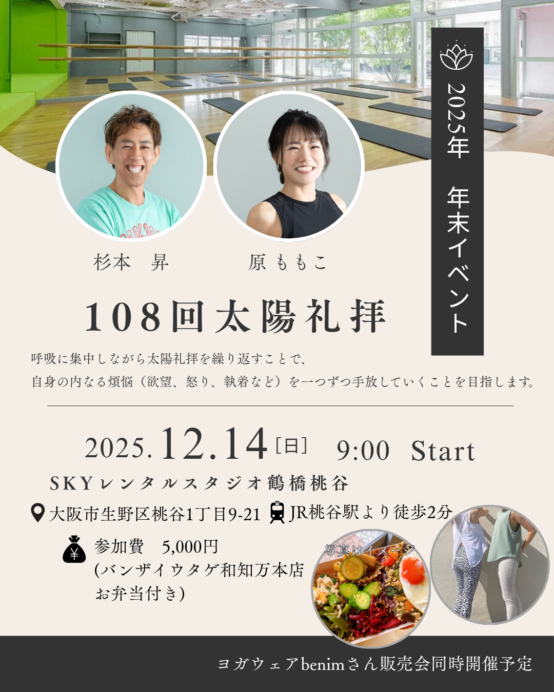 年末最後と恒例イベント。動く瞑想 呼吸に集中しながら太陽礼拝を繰り返すことで、自身の内なる煩悩(欲望、怒り、執着など)を一つずつ手放していくことを目指します。 年末にピッタリのクラスです。 今回はbenimさんのヨガウェアの販売会を同時開催。 ご試着もしていただけます! 又レッスン後にはバンザイウタゲ和知万本店さんのお弁当を楽しんでいただけます! 開催時間9:00〜2時間程度 終了後お弁当をいただきます。