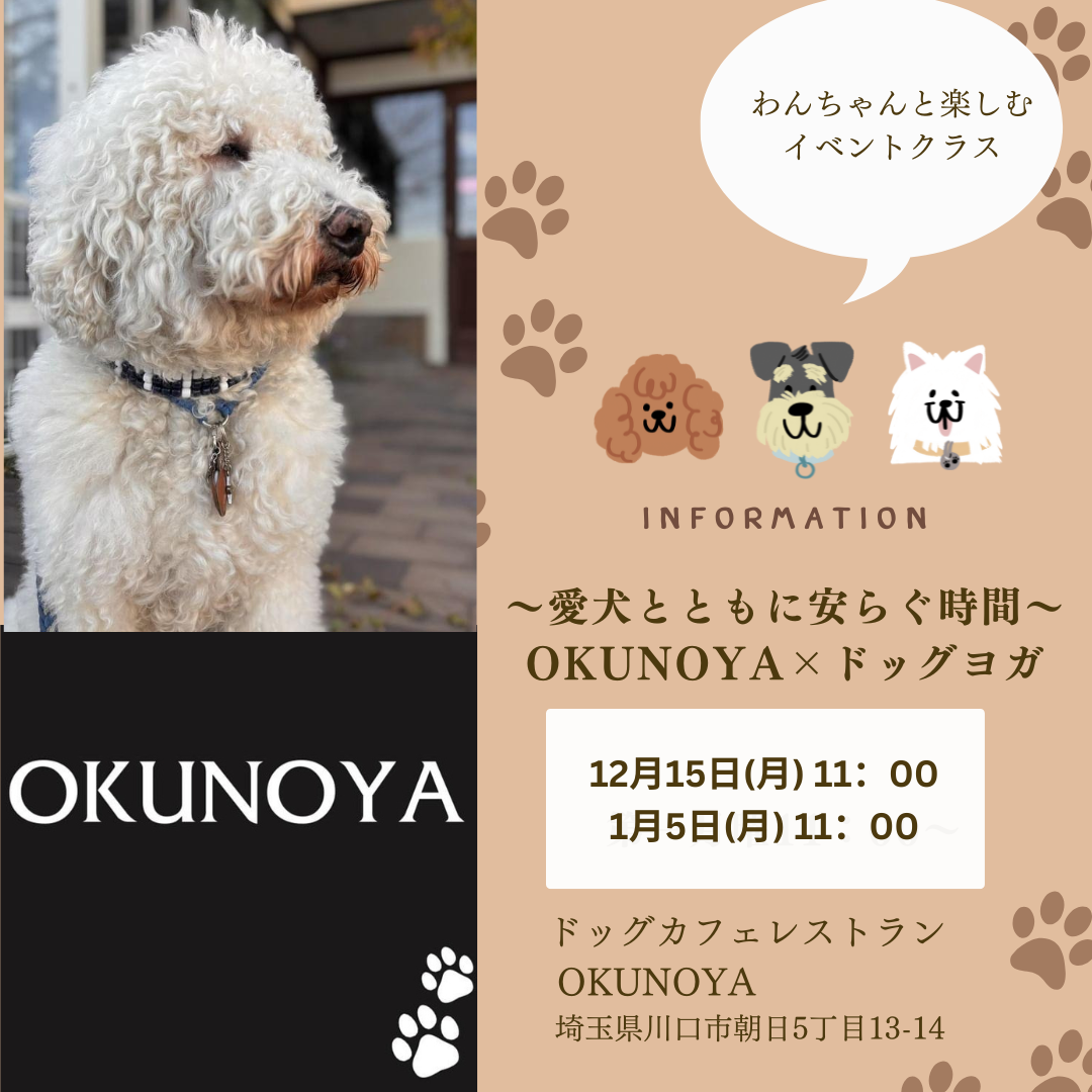 \OKUNOYA×わんちゃん連れOKヨガ/ ~わんことともに安らぐ時間~ OKUNOYA×ドッグヨガ🐾 川口市のドッグカフェレストランOKUNOYAさんにて わんこ連れOKのリフレッシュヨガを開催します♩ 営業前のお店を貸切しますので、のびのびとご参加いただけます。 オーナーさんもわんちゃん好きでわんこフレンドリー。 看板犬のセイ君(オーストラリアンラブラドゥードゥル) が元気にお出迎えしてくれます。