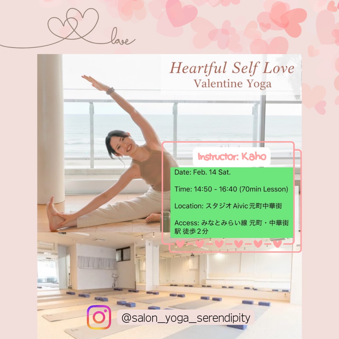| イベント内容 | かほ先生よりメッセージ(レッスン内容) 「この日はバレンタイン。愛や感謝をテーマにクラスを行います♡ 愛すること、感謝すること、受け入れること、 なんだか言葉にするとむず痒いけれど、どれも特別なことではなく、本当は日常の中にあるもの。そんなことをヨガ哲学と絡めながらお話ししたり、そしてハートをひらくヨガとヨガニードラを通じて、 心も体も内側からほっと温まり、自分にとっての「真実の愛」を感じられるかも?! みなさまのご参加を心よりお待ちしています!」 2/14(土) 場所:レンタルスタジオAivic元町中華街 みなとみらい線 元町・中華街駅 徒歩2分 Time Schedule 14:50 集合・集金 15:10-16:20 レッスン 16:20-16:40 集合写真撮影(※希望者のみ)、撮影自由時間 17:00-18:00 氷上のアートとアイススケート ※希望する方は□スケート参加チケ1,700円(当日現金払い)もお申込み下さい。 ※混雑時には入場規制・時間制限を設ける場合があります。その場合、又は悪天候時は食事会とします。 ※ヨガレッスン又はスケートの際の怪我には主催者・インストラクターは一切の責任を負いかねますのでご了承の上、ご参加下さい。 持ち物 □ヨガが出来る格好や動きやすい服装 □防寒対策(スケートに参加する方は帽子や手袋など) □飲料水 ※ヨガマットはご用意がありますがご自身のが良ければご持参下さい。 |