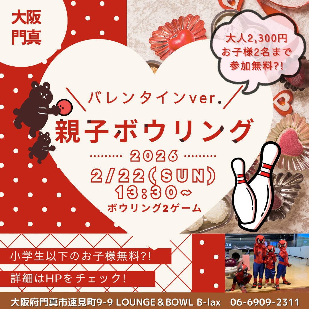 | イベント内容 | 【大阪|門真】B-laxバレンタインver.🍫 // 📣 おやこボウリング ✨ バレンタインver.🍫 \\ ⭐️親子ボウリングバレンタインver.🍫 参加賞にお菓子詰め合わせをプレゼント✨ ⭐️7本以上倒すとルーレット(スロット)が回転! 当たりが出たらお菓子プレゼント✨ ⭐️2ゲーム終了後はミニゲーム! 今回は ・Balloon bomb game(バルーンボムゲーム) お菓子詰め合わせも用意しています🎈 ミニゲームは過去にビンゴ大会、スーパーボールすくい、射的、宝探し等行いました☀️ 事前予約制で、とーーっても人気なイベントとなっておりますので、参加ご希望のお客様はお早めにご予約ください💠 ご予約は店舗電話、またはHPからお申込みくださいませ✨ 📍大阪府門真市速見町9-9 HPや料金の詳細はプロフィール【 @lounge_bowl_blax 】をチェック!たくさんのご予約お待ちしております❤ 🍊🍊🍊🍊🍊🍊🍊🍊🍊🍊🍊🍊🍊🍊 B-laxは19:00から1階のみ アミューズメントバーに大変身! 詳しくは【@blax_amusement_bar 】をチェック! 🍊🍊🍊🍊🍊🍊🍊🍊🍊🍊🍊🍊🍊🍊 #親子ボウリング #門真 #守口 #大阪お出かけ #家族イベント #スポッチャ #大阪子連れ #大阪万博 #大阪イベント #ららぽーと門真 すぐ #速見小学校 #古川橋 |