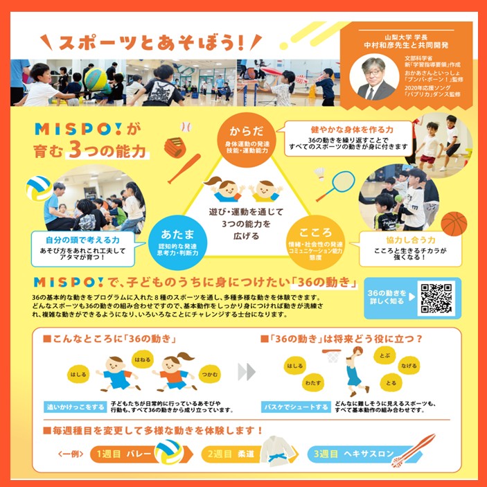 4月新規開校!ミズノが開発したお子さま向けマルチスポーツスクール「MISPO!」の体験会です。 「MISPO!」は様々なスポーツを楽しみながら、健やかな身体と思考力を育みます。 運動が苦手なお子さまも、これから運動を好きになってほしいお子さまも、大歓迎! 将来につながる“運動の土台づくり”を、今ここから。ぜひお子さまのご参加をお待ちしています!