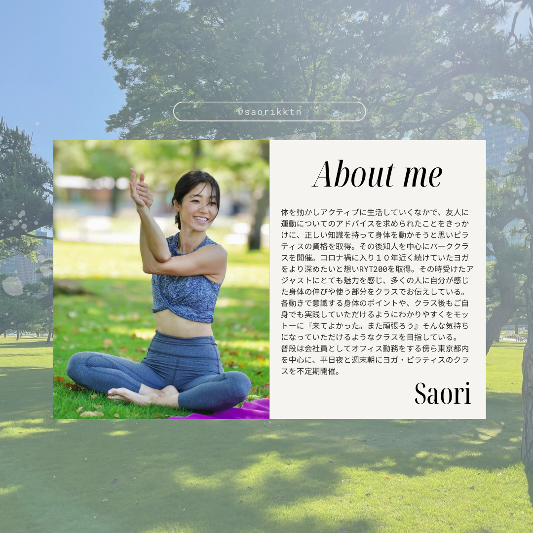 | イベント内容 | ●開催日時: 2026年3/3 火曜 20:00-21:00 ●参加費)※ ¥3000 *早割300円OFF 開催日の2週間前までにお申し込みを完了してくださった方は、300円OFFさせていただきます。 ●講師:Saori Instagramアカウント @saorikktn https://www.instagram.com/saorikktn?igsh=Mzl2bWdiOXVmcmht&utm_source=qr パーククラスを中心に、2017年からピラティス・ヨガの要素を取り入れたクラスを開催しています。 キャンドルナイト、ビーチクラス、その他皆様の笑顔が見たくてイベントクラスも多く開催しています。 気になっていただいた方は是非一度ご参加いただけたら幸いです。 パーククラスを中心に、2017年からピラティス・ヨガの要素を取り入れたクラスを開催しています。 キャンドルナイト、ビーチクラス、その他皆様の笑顔が見たくてイベントクラスも多く開催しています。 気になっていただいた方は是非一度ご参加いただけたら幸いです。 保有資格: 全米ヨガアライアンス取得 DK pilates certificate アーユルヴェーダファスティングアドバイザー セラピカルヨガ ヨガニドラーインストラクター |