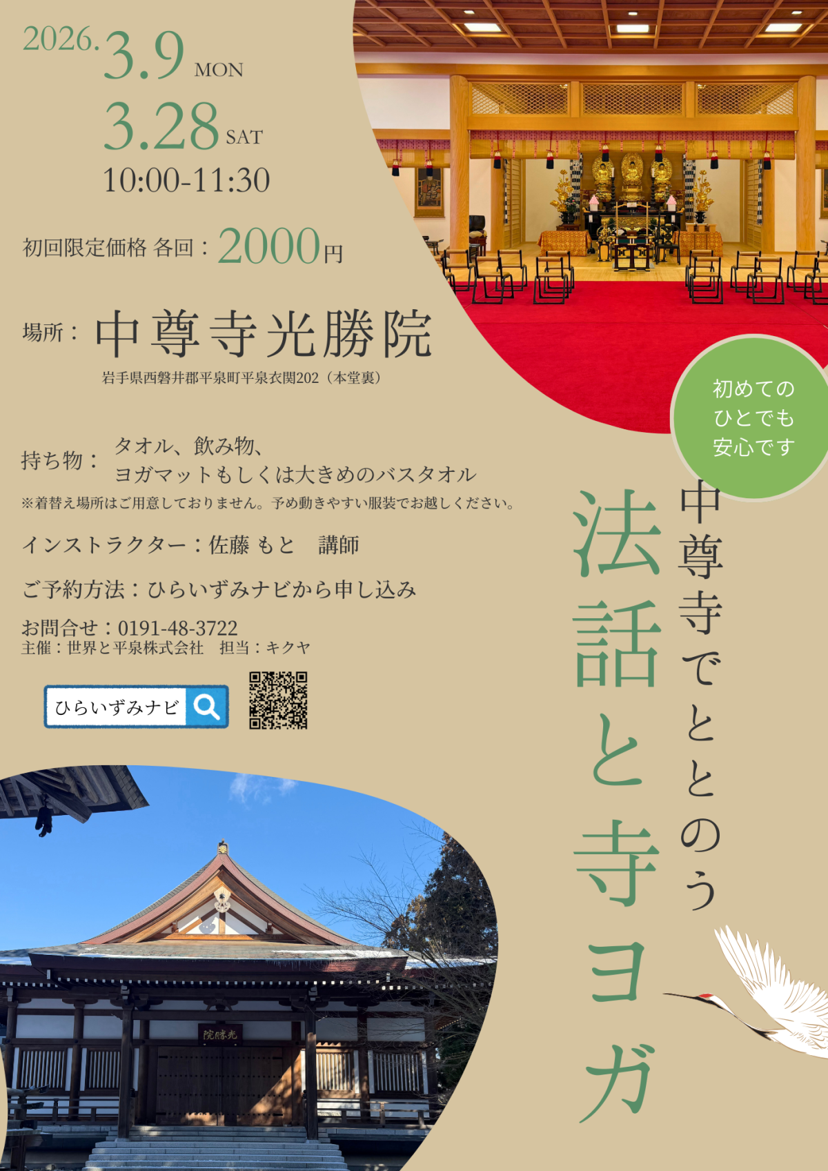 世界遺産・中尊寺で、短い法話とヨガを組み合わせた、心と身体を整えるイベントです。 はじめに法話を聴き、その後、無理のないヨガでゆったりと身体を動かします。 「お寺は特別な時に行く場所」というイメージではなく、日常の延長として、気軽に立ち寄れる場所であってほしい。 そんな想いを込めて開催いたします。 性別・年齢・ヨガ経験を問わず、未経験の方も大歓迎の内容です!