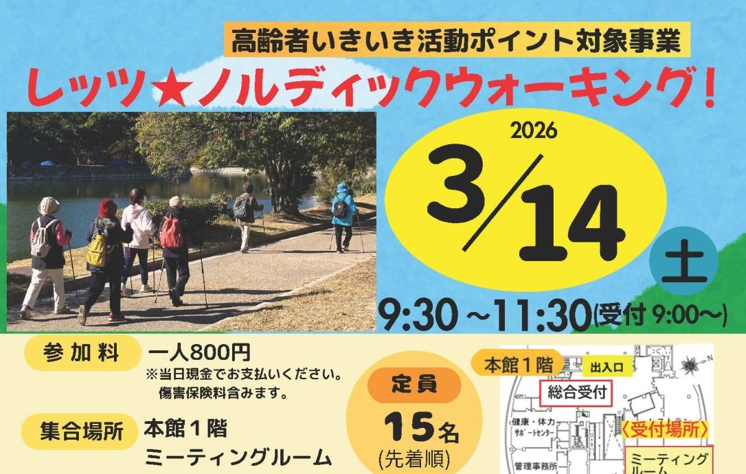 | イベント内容 | ノルディックウォーキングは、専用のポールを使って歩くことで、背筋がピンと伸び、歩幅が広がり、美しいウォーキングフォームが身につけられます。仲間と共に健康づくり、楽しく歩いてみませんか。ご参加お待ちしております。 ~高齢者いきいき活動ポイント対象事業~ |