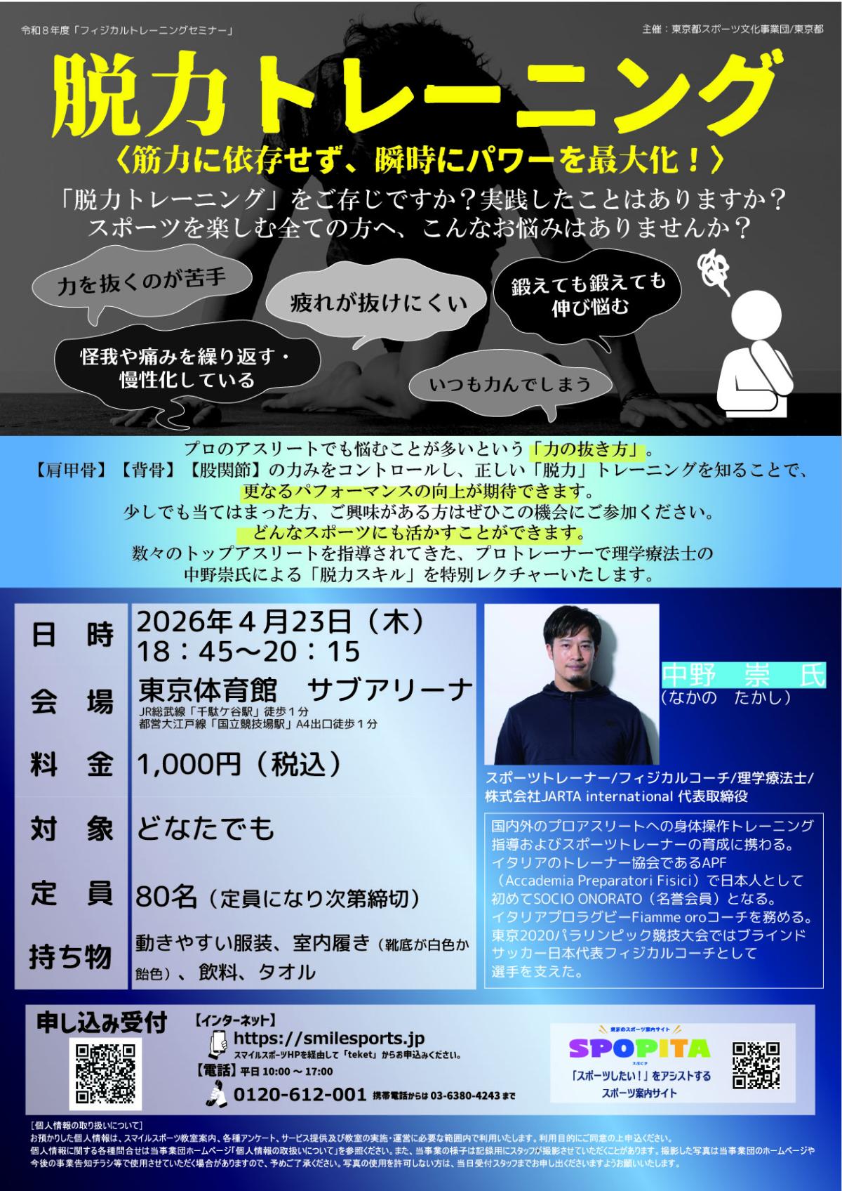 「力を抜くのが苦手」「疲れが抜けにくい」「けがを繰り返す」「鍛えても鍛えても伸び悩む」日々のトレーニングで、こんなお悩みはありませんか? プロのアスリートでも悩むことが多いという「力の抜き方」。【肩甲骨】【背骨】【股関節】の力みをコントロールし、正しい「脱力」トレーニングを知ることで、更なるパフォーマンスの向上が期待できます。 少しでも当てはまった方、ご興味のある方はぜひこの機会にご参加ください!