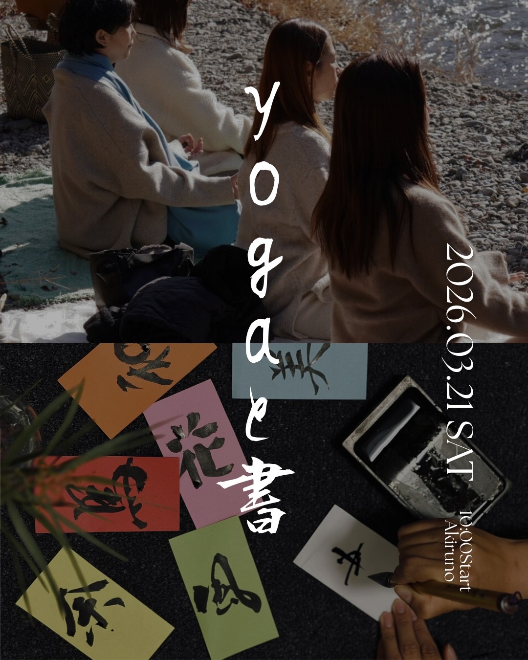 秋川渓谷沿いを歩きながら 川の音に耳を澄ませ 五感をひらく小さな旅。 書道は、書く前の“整える時間”がとても大切です。 阿伎留神社へ立ち寄り参拝した後は古民家へ向かいます。 ヨガで身体と心をゆるめたあと 〝今〟の自分が生み出す文字を そっと見つめてみましょう。 こんな方におすすめ/ 日本文化に触れたい 自然を味わいたい ゆっくり身体をうごかしたい
