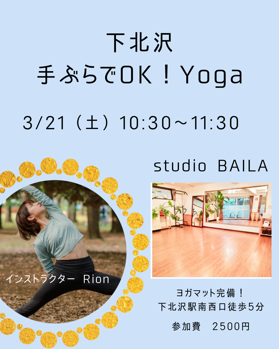| 持ち物 | ヨガマットは用意がありますが、衛生面など気になる方はご持参ください |
