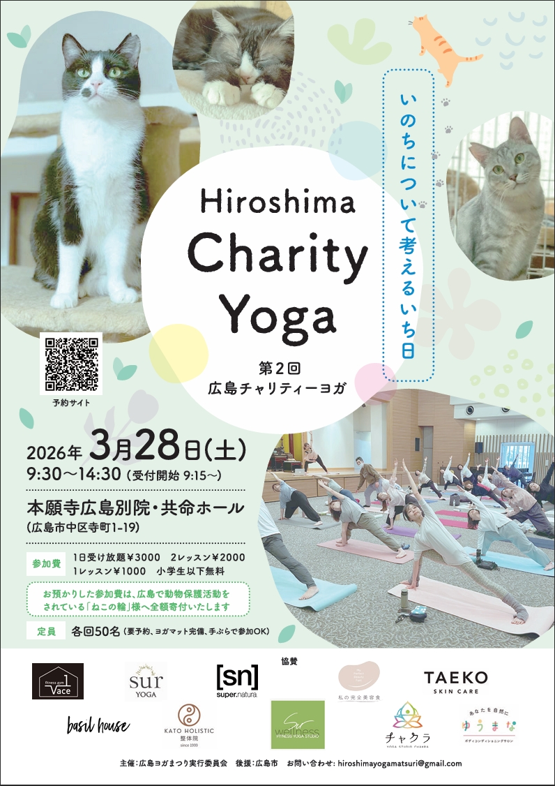 昨年、能登半島復興支援募金を行った第1回に続いて2回目の開催です。 今回は、広島市で動物保護活動をされている 「ねこの輪」さんへ参加費を全額寄付いたします。 ヨガを通して、少しでも優しい循環が広がりますように。 皆さまのご参加を心よりお待ちしています。
