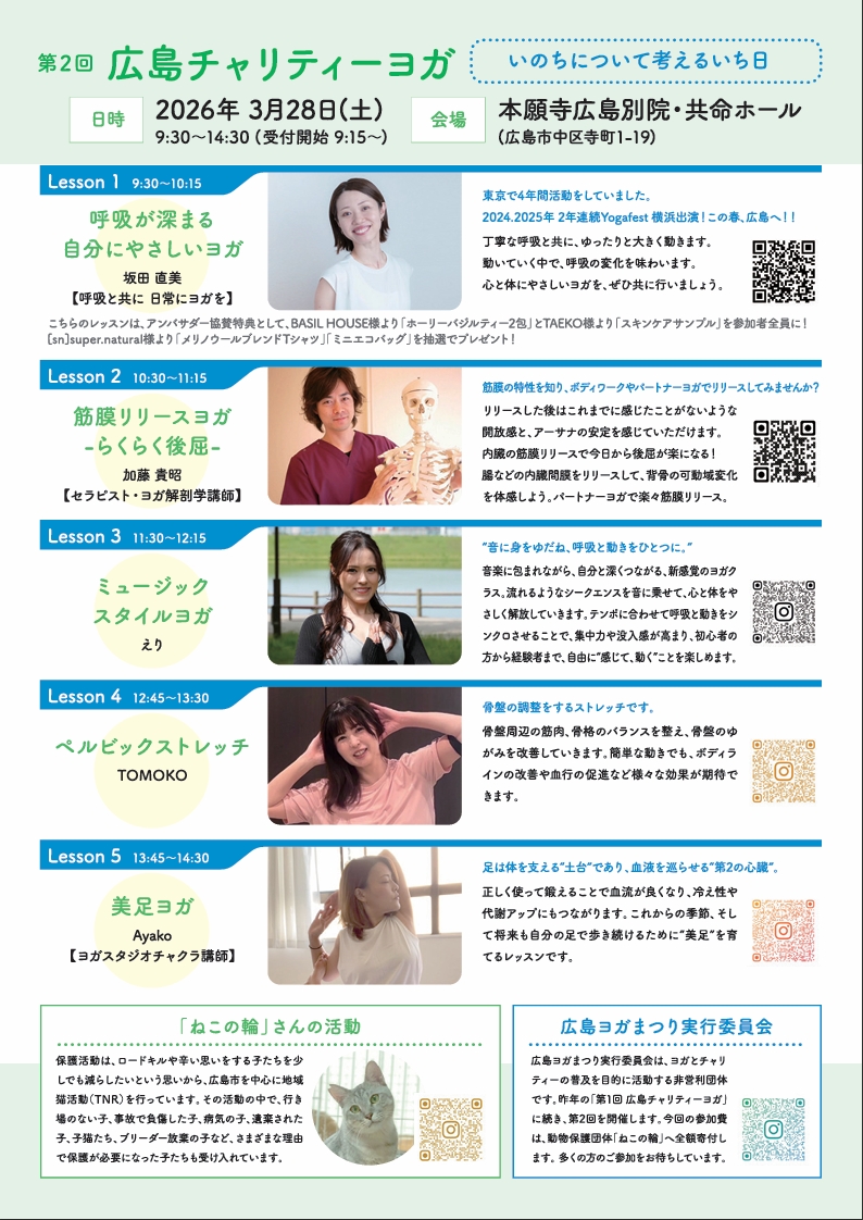 申込方法: https://www.instagram.com/hiroshima_yoga_matsuri/ 「広島ヨガまつり」のインスタグラムのプロフィールのリンクもしくはチラシのQRコードからお申し込み出来ます。 |
