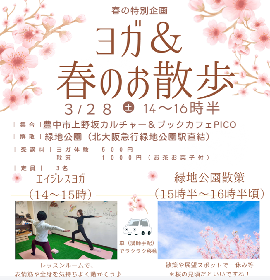 | イベント内容 | ➀14時~15時 PICO レッスンルームにてヨガ ②講師手配車にて、緑地公園へ ③15時半~16時半 緑地公園散策 解散 ●参加費: ヨガ体験500円(ヨガ体験のみ参加も可能です) 散策参加1000円(菓子飲み物含む)☆現金にて ●講師:TOSHIE 頭から足先迄、全身の循環を高めて、溢れる笑顔までもキレイに。美容家発想のオリジナルカリキュラムはどなたにも気軽に楽しんで頂けるレッスンです。 RYT 200 小顔フェイシャル・シニアヨガ・チェアヨガインストラクター パーソナルリンバケアリスト 薬膳コーディネーター yoga _zen_toshie |