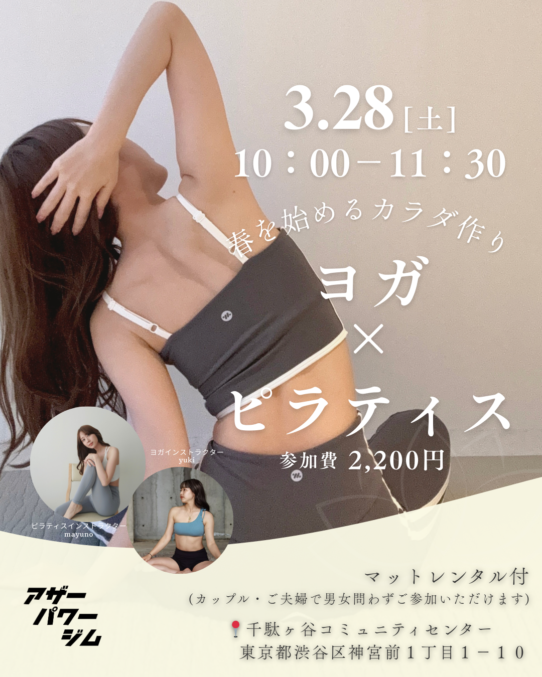 春を始めるカラダ作り ピラティスとヨガを組み合わせたイベント。 ぜひお越しください! お友達やパートナーの方にお声かけいただきぜひ一緒にご参加ください!