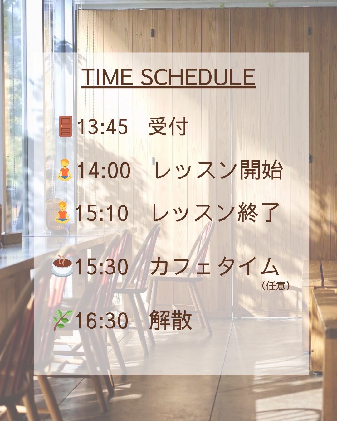 | 持ち物 | •ヨガマット •飲み物 •動きやすい服装 •参加費 |