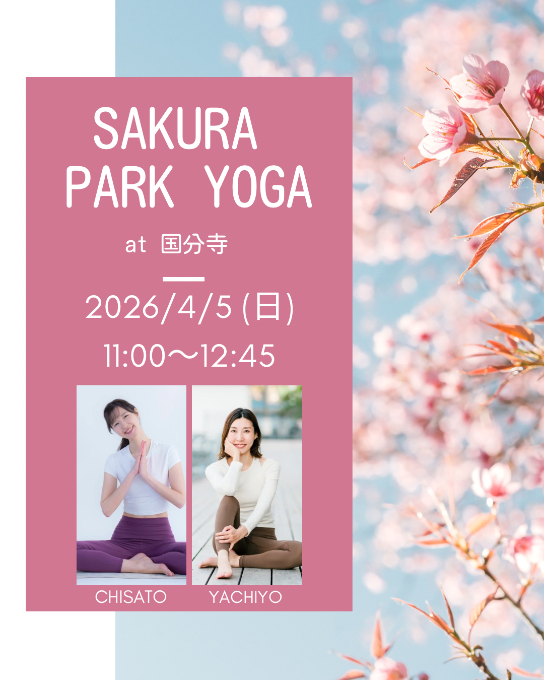 \\ 桜満開の中でパークヨガ // 4月5日(日)お昼に 八千代と知里で 第3回SAKURA PARK YOGA を行います! 3回目となる桜ヨガですが 今回も⋯というよりはリベンジで 武蔵国分寺跡での開催です! 今年こそ!! 暖かくて桜満開の中で開催です!!!笑 . 青空の下で気持ち良く伸びる リフレッシュヨガの後は 八千代先生のお友達で 普段低糖質スイーツ・パンショップを運営している はるかさんのお弁当BOXと共にピクニックを開催♡ 昨年もご用意いたしましたが 今回は「春の和風弁当」を用意しています もちろん低糖質弁当です! . 第3回は、より季節を意識した ヨガイベントになっておりますので ヨガで体を動かし、 桜とお弁当で季節を楽しみましょう! 皆様のご参加、 心よりお待ちしています