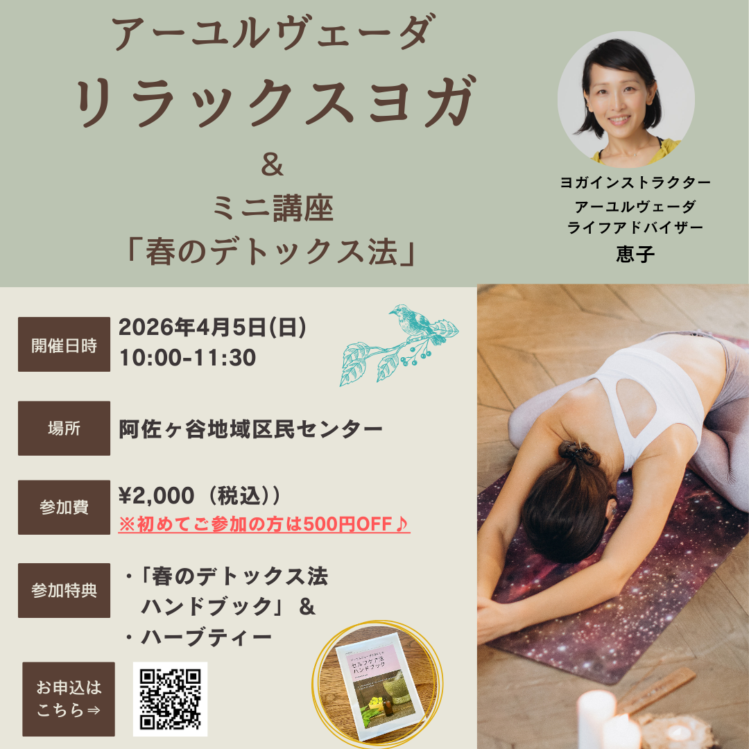 | イベント内容 | ●開催日時: 2026年4月5日(日)10:00〜11:30 〈当日のプログラム〉 10:00〜11:00 ヨガ 11:00〜11:30 ミニ講座&お茶タイム 「アーユルヴェーダを基にした”春のデトックス法”」 ※ミニ講座&お茶タイムは自由参加☆途中退出OK ●後半のミニ講座では、 アーユルヴェーダを元にした“春のデトックス法”を ご紹介します(^^) 参加者全員に、 「春のデトックス法ハンドブック」と 「ハーブティ」をプレゼント! ★初回割引キャンペーン実施中★ 当方が主催するクラスに初めて参加される方は、 参加費が500円割引となります♪ (2,000円→1,500円!) ぜひこの機会にお試しください♪ 皆様のご参加をお待ちしています(*^^*) |