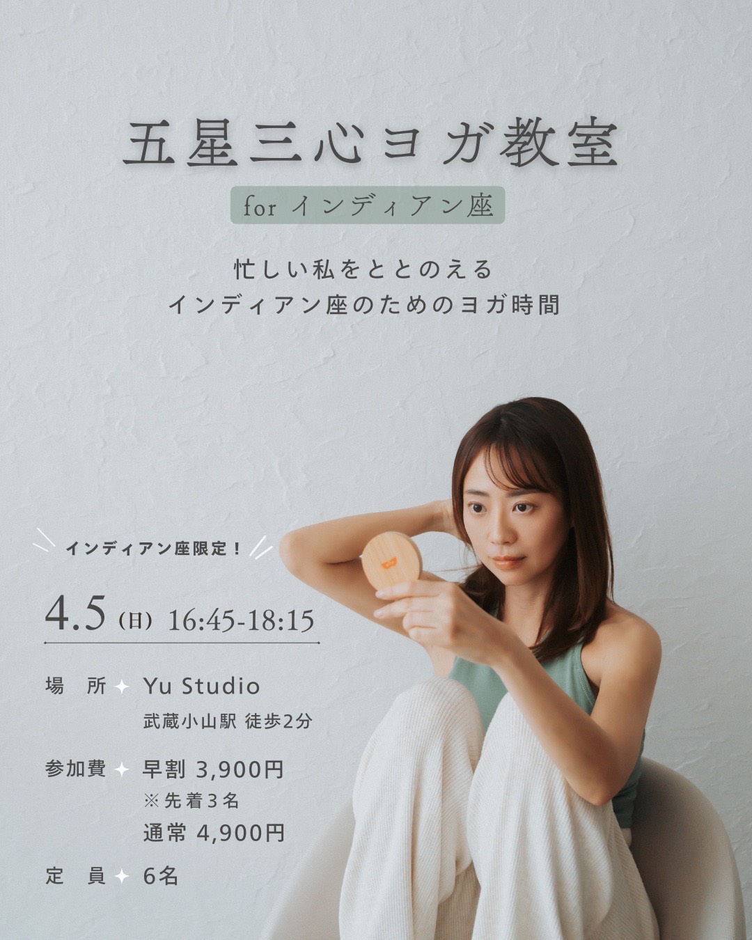 【ご参加にあたって】 ◆今回は金・銀のインディアン座の方を対象としたヨガクラスです。※その他のタイプも順次開催予定 ◆妊娠中の方、ケガや体調に不安がある方はご参加をお控えください。 ◆動きやすい服装でご参加ください。伸縮性のあるトップス・ボトムスがおすすめです。 ※スタジオに更衣室があります ◆当日撮影した写真をSNS等でご紹介させていただく場合があります。※掲載NGの方は当日お知らせください。 ◆安心してご参加いただくため、営業・勧誘目的でのご参加はご遠慮ください… |