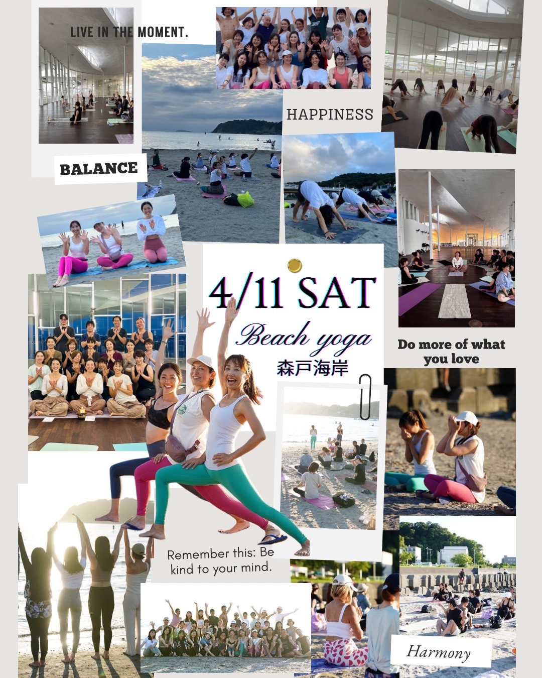 毎回大好評満員御礼の珠理 ・makki・Saoriのヨガイベントを 今年も開催致します 春光うららかな季節となりました。 やわらかな潮風と、あたたかな陽ざしに包まれる森戸海岸でビーチヨガを開催します。