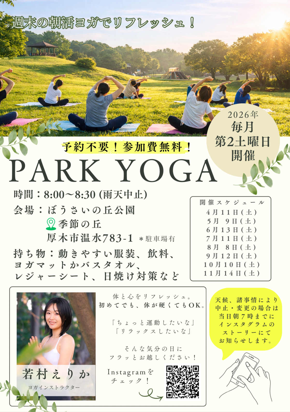 | イベント内容 | 開催日時:2026年 開催時間 8:00〜8:30 4月11日(土) 5月 9日(土) 6月13日(土) 7月11日(土) 8月8日(土) 9月12日(土) 10月10日(土) 11月14日(土) ●講師:若村えりか 「ちゃんとやらなきゃ」と思わなくていい場所をつくりたくて、ヨガをお伝えしています。 比べず、無理せず、自分のペースで。 その日の自分にちょうどいい過ごし方ができたら十分です。 一緒にヨガができることを楽しみに、 現地でお待ちしております。 Instagram:wacayoga |