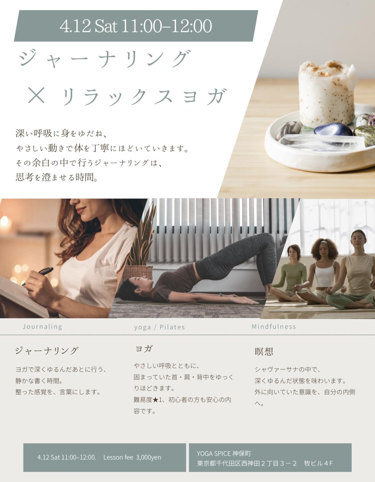 忙しい毎日。 気づけば、呼吸が浅くなっていませんか? このクラスは “頑張るため”ではなく “ゆるむため”の時間です。 やさしい呼吸と 難易度★1のリラックスヨガで 首・肩・背中をゆるめながら 緊張をそっと解いていきます。 最後はジャーナリング。 静かな時間の中で、 自分の本音を紙に書き出します。 なんとなく疲れている 頭がずっと忙しい ひとりで静かに整う時間がほしい 深く癒やされたい そんな方におすすめです。 ヨガが初めての方も大歓迎。 体が硬くても大丈夫。 “気持ちよさ”を優先するクラスです。 神保町の落ち着いた空間 YOGA SPICEにて 少人数で丁寧に行います。 日常から少し離れて 自分に戻る60分を過ごしませんか?