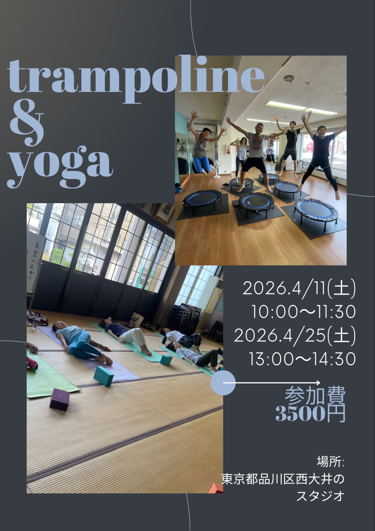 | イベント内容 | ●開催日時: 2026年4月11土曜 10:00〜11:30 2026年4月25土曜 13:00〜14:30 ●講師:MIDORI ヨガ、トランポリン、筋膜リリース、キックボクシング、などを教えていました! 今は、ヨガ、トランポリン、筋膜リリース、の3本だてでお仕事しています。 とにかく楽しいトランポリン そして心地よいヨガ 整う筋膜リリース 一緒にやりましょう |