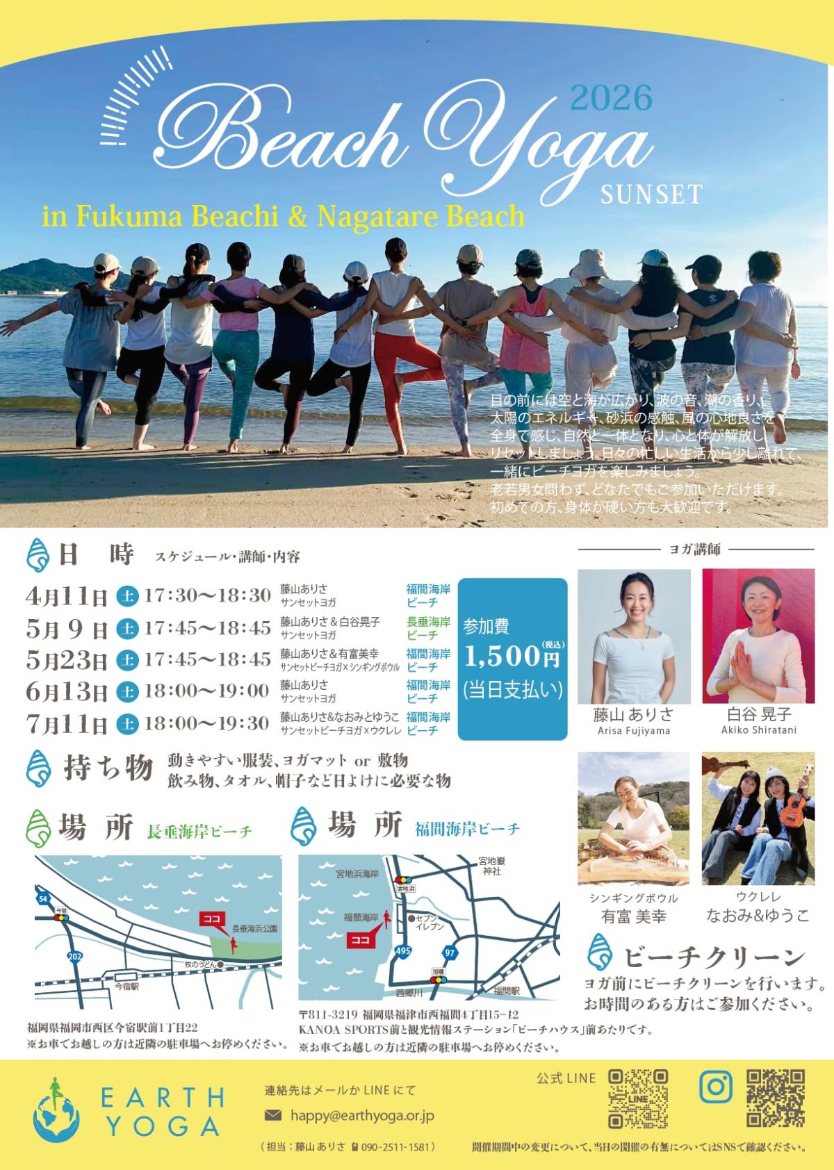 | イベント内容 | ●開催日時: 2026年4月11日(土)サンセットヨガ / 17:30~18:30 in 福間海岸 2026年5月9日(土)サンセットヨガ / 17:45~18:45 in 長垂海岸 2026年5月23日(土)サンセットヨガ&シンギングボウル / 17:45~18:45 in 福間海岸 2026年6月13日(土)サンセットヨガ / 18:00~19:00 in 福間海岸 2026年7月11日(土)サンセットヨガ&ウクレレ / 18:00~19:00 in 福間海岸 今年の開催場所は 福間海岸 と長垂海岸 2拠点となっています。 詳しくはチラシをご確認ください。 シンギングボウルやウクレレの音色に包まれながら 心と体が解放される至福のリセットタイムも♪ 皆さまと海でお会いできることを 心から楽しみにしています ●講師:藤山ありさ インスタグラム:https://www.instagram.com/arisa_earthyoga/ ヨガ・瞑想歴23年、延べ5万人以上を指導をさせていただいています。 大学・企業・クリニック・ホテルなどでの講師経験を経て、現在は全国でクラス、ワークショップ、個人セッション、養成講座を開催中。卒業生は160名以上にのぼります。 雑誌・ラジオ・企業広告・野外イベントなどにも出演し、国内外でのリトリートやSUPヨガなど多彩な活動を展開。全米ヨガアライアンス認定上級ヨガインストラクター(E-RYT500) そんな私が、あなた本来の輝きを目覚めさせ、ヨガの旅へお共いたします。 今ここにどっしりと根を張って、健康的でしなやかに生きていく。 ヨガや瞑想、自然の恩恵を通じて、自身の内なる穏やかさ、 健やかさを育んでいきましょう。 ”本当の自分を生きて、愛と喜びの人生を送る”を モットーにサポートをさせていただいています! |
