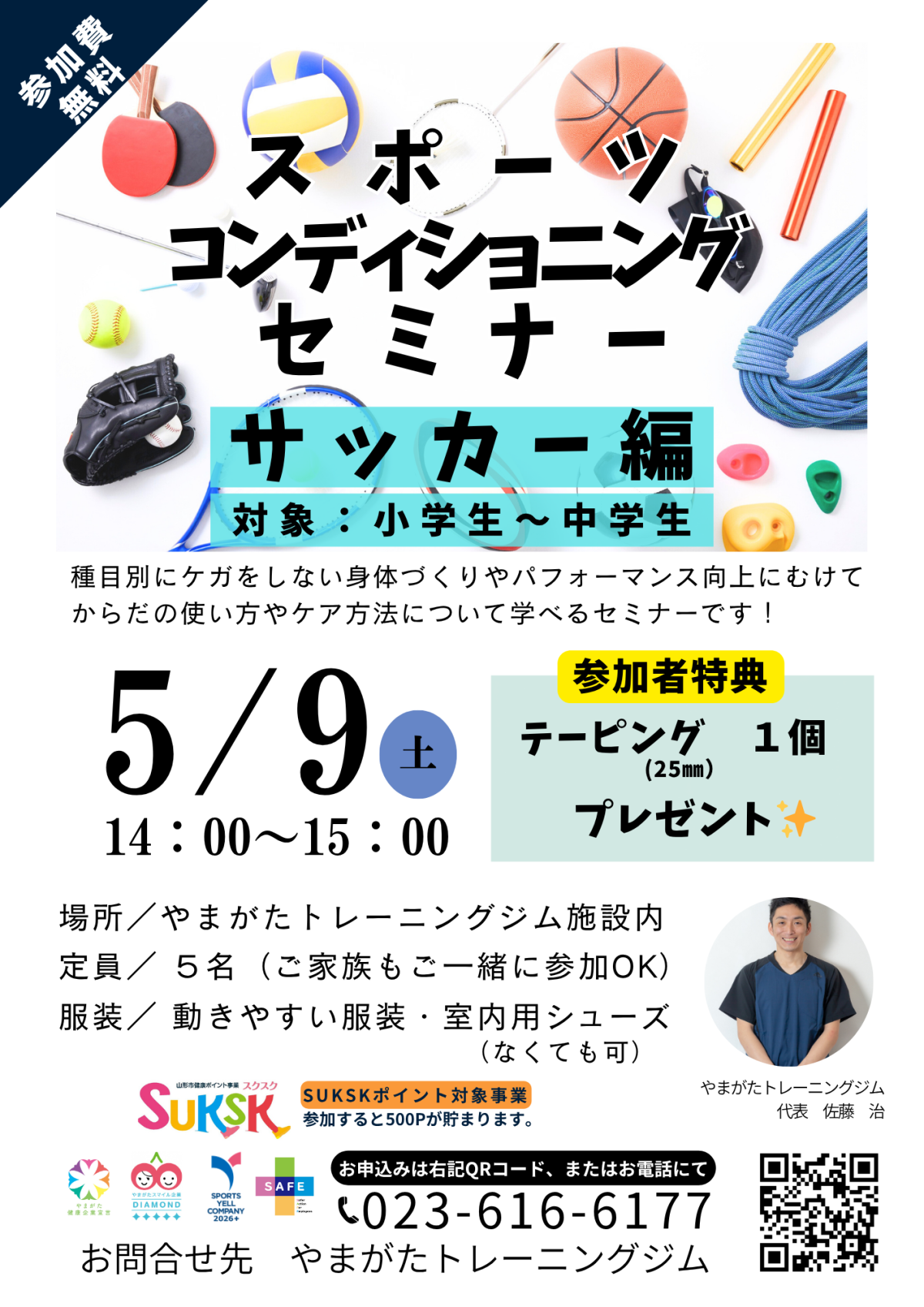 | イベント内容 | 【5/9㈯無料開催】スポーツコンディショニングセミナー サッカー編 【対象:小学生~中学生】 サッカーに特化してケガをしない身体づくりやパフォーマンス向上にむけてのからだの使い方やケア方法について学べるセミナーです。参加するとテーピング25㎜1個プレゼント! ご家族も一緒に参加OK ▶SUKSKポイント対象事業◀ 参加すると、500ポイント貯まります。 ■開催日: 2026年5月9日 (土) 14:00~15:00 ■開催地:やまがたトレーニングジム施設内 ■講師:やまがたトレーニングジム代表 佐藤 治 ■定員:5名(ご家族も一緒に参加できます) ■服装:動きやすい服装、室内用シューズ(なくてもOk) ■お申し込み:お電話/申込QRコードのいずれかでお申し込みください。 (定員に達し次第受付締め切り) お問い合わせ やまがたトレーニングジム ℡:023-616-6177 |