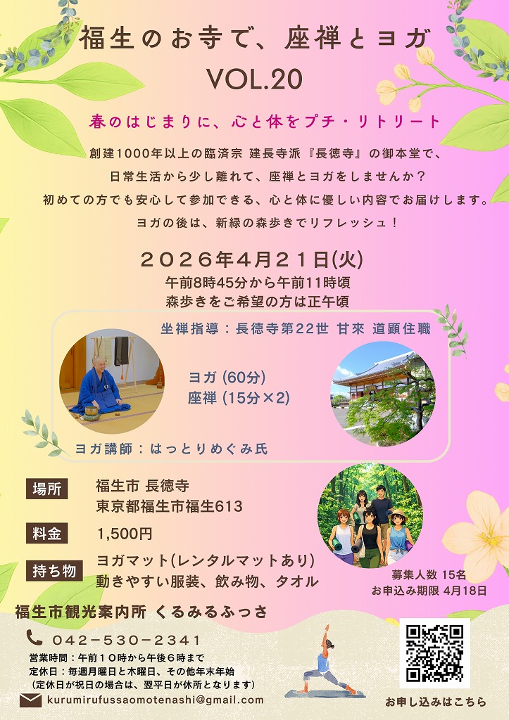 福が生まれる街の福生で! 日常生活からちょっと離れて、座禅とヨガをしませんか? 創建1000年以上の臨済宗 建長寺派『長徳寺』の御本堂で、 初めての方でも参加できる、心と体にやさしい内容でお届けします。 ヨガの後は、新緑の森歩きもご用意しています。
