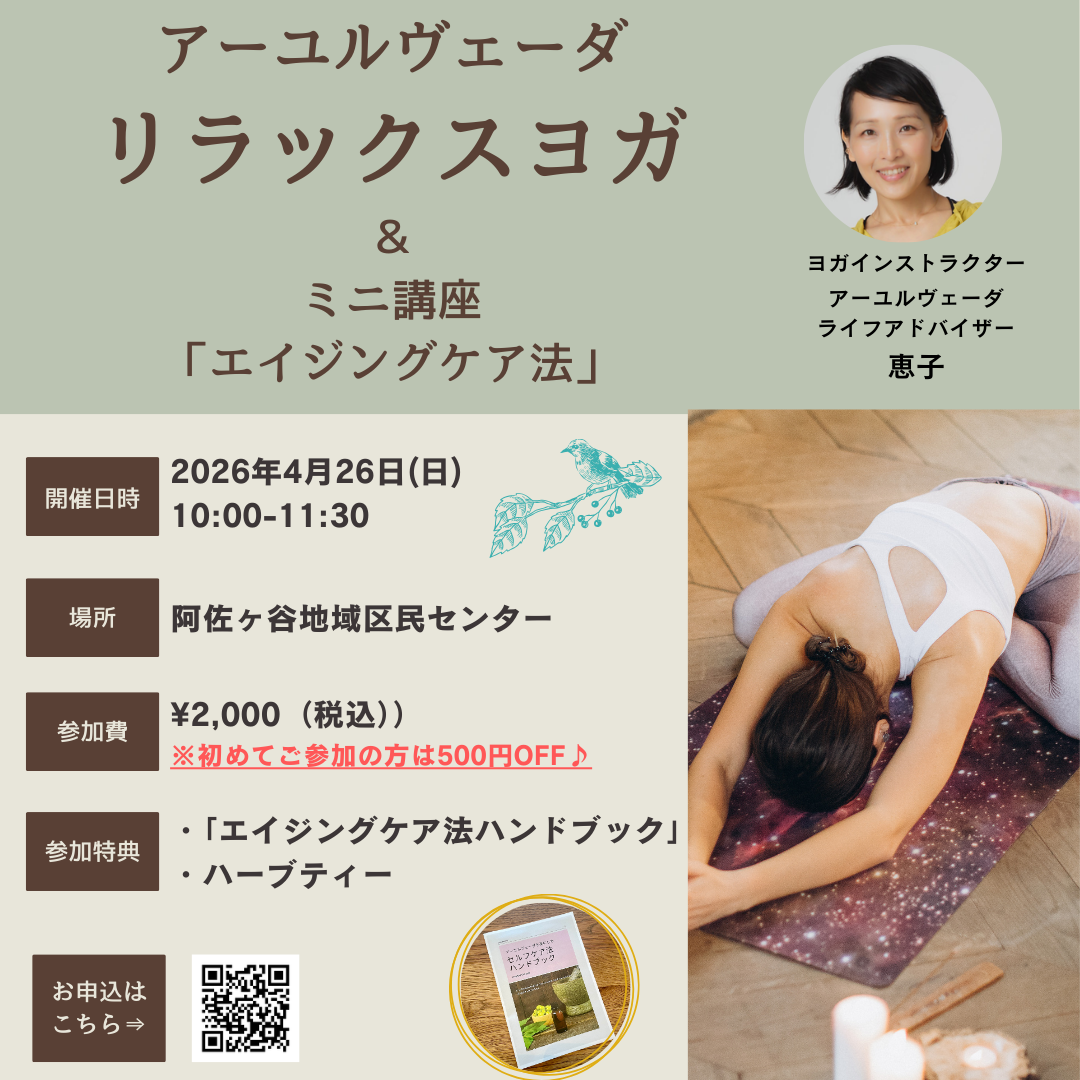 | イベント内容 | ●開催日時: 2026年4月26日(日)10:00〜11:30 〈当日のプログラム〉 10:00〜11:00 ヨガ 11:00〜11:30 ミニ講座&お茶タイム 「アーユルヴェーダを基にした”エイジングケア法”」 ※ミニ講座&お茶タイムは自由参加☆途中退出OK ●後半のミニ講座では、 アーユルヴェーダを元にした“エイジングケア法”を ご紹介します(^^) 参加者全員に、 「春のエイジングケア法ハンドブック」と 「ハーブティ」をプレゼント! ★初回割引キャンペーン実施中★ 当方が主催するクラスに初めて参加される方は、 参加費が500円割引となります♪ (2,000円→1,500円!) ぜひこの機会にお試しください♪ 皆様のご参加をお待ちしています(*^^*) |