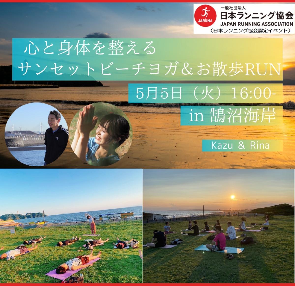 人生100年時代、運動習慣を継続させよう! 生涯に渡り、健康で長生きするためにも日頃の運動が大切です。運動は3種類に分類されます。 ・有酸素運動(ウォーキング、ランニング、水泳、サイクリング、長距離走) ・無酸素運動(筋力トレーニング、短距離走) ・ストレッチング(柔軟体操、ヨガ) 開運ヨガインストラクターりな先生とのコラボイベント!鵠沼海岸でのランニング×サンセットビーチヨガを行います♪ 本イベントは健康維持に最適な程よいレベルの有酸素運動をしながら対面でのコミュニケーション力を向上させることをテーマにしています。参加者のレベルに合わせて、走りますので、ランニング初心者や女性の方も安心してご参加下さい。 皆で楽しく走って健康レベルを上げましょう!