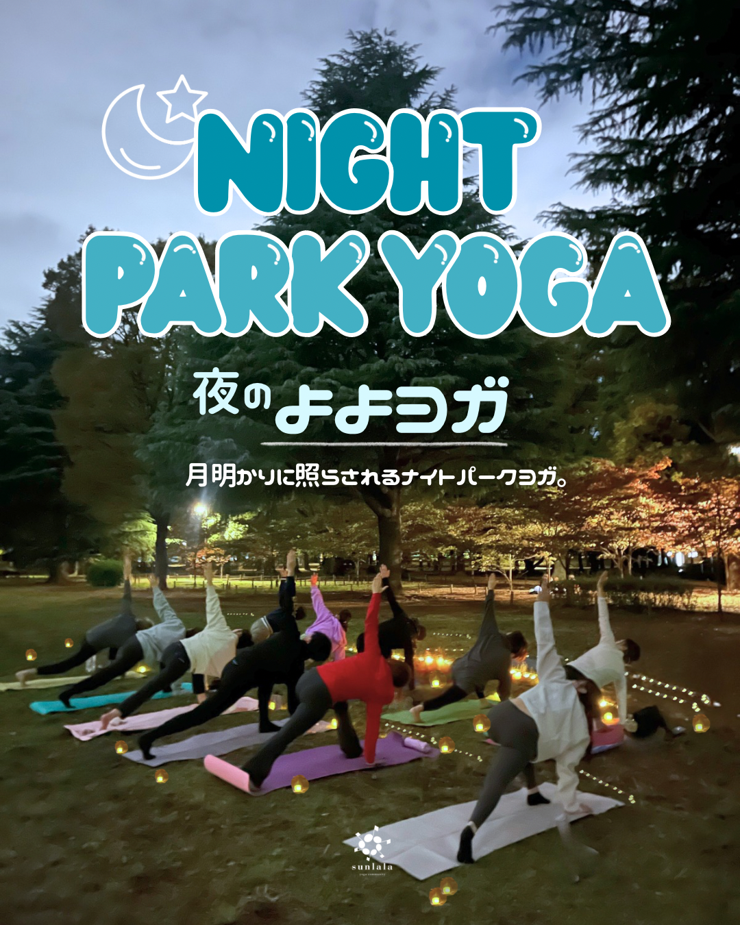 よよヨガとは、sunlala yoga communityが春から秋まで約8ヶ月にわたって定期開催している代々木公園パークヨガ。略して「よよヨガ」です! その中でも夜のよよヨガは、キャンドルライトの灯りとともに過ごすナイトパークヨガです。 これまでによよヨガシリーズには、のべ300名以上が参加。 朝の太陽の時間も、夜の静かな時間も、それぞれの心地よさを求めて多くの方に選ばれてきました。 昼のにぎやかな空気とは少し違う、静かでやわらかな夜の公園。 ゆっくりと呼吸を深めながら、1日の終わりにたまった疲れや思考をやさしく手放していきます。 自然の音や風に包まれながら、“力を抜いてリラックスした自分”に戻るひととき。 忙しい毎日の中に、心と体をリセットする夜の習慣を。 またこの場所で、お会いできるのを楽しみにしています。 ※土曜朝には、お日様の下での「よよヨガ」も開催しています。