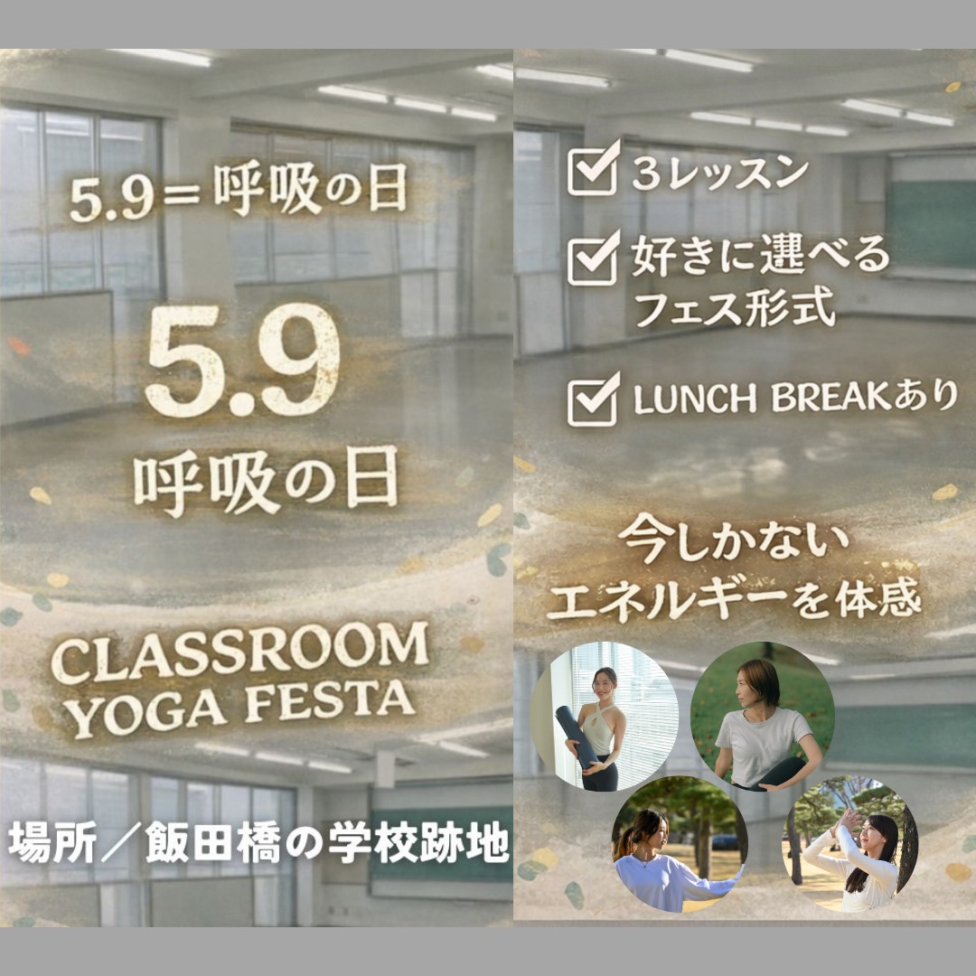 この日、この場所、このメンバーだから生まれるエネルギーを、 一緒に味わいましょう。5.9、教室でお会いできるのを楽しみにしています。 【コンセプト】 5月9日。呼吸の日。かつて子どもたちが学び、笑い、夢を描いた小学校の教室。 “自分自身”と向き合い心身共に育てる時間を過ごしませんか?ヨガインストラクター歴2年未満のフレッシュなインストラクターがレッスンを担当。完璧じゃない。でも“今しかない熱量”と“まっすぐな情熱”。ご安心下さい!この日の為にしっかりと準備とインストラクター全員でサポートします。 午前中はやさしい目覚めのヨガとお昼休みを挟んで午後はテーマの異なる2つのレッスン。 まるでフェスのように、一日かけて“わたし”を整えていく体験。 深く吸って、大きく吐く。 呼吸を重ねるたびに、身体も、心も、少しずつ目を覚ましていく。 これはただのヨガイベントではなく、「呼吸を楽しむフェス」。 好きな時間を楽しむもよし、1日通しで味わうもよし。 ここはエネルギーを交換する場所。 参加者はインストラクターを是非評価とレビューをお願いします。 辛口評価も大歓迎!今後の参考と成長の糧にします。 迷いも学びもリアル。 フレッシュなインストラクターとあなたも「はじめの一歩」を過ごしませんか? 天気が良ければ窓を開けて行います。