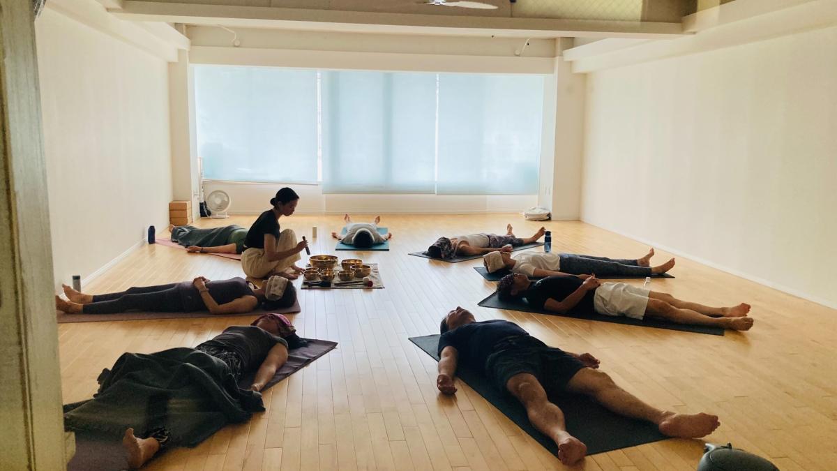 ゆったりとアーサナと呼吸法で体を整えた後、シンギングボウルの音浴とともにシャバーサナで体を休めましょう。 シンギングボウルの響きは、自然の音のような1/fゆらぎの心地よさで、呼吸と心をゆるやかに整えていきます。 常に意識が外側に向きがちな忙しい毎日の中で、自分の内側に意識を向ける助けとなります。