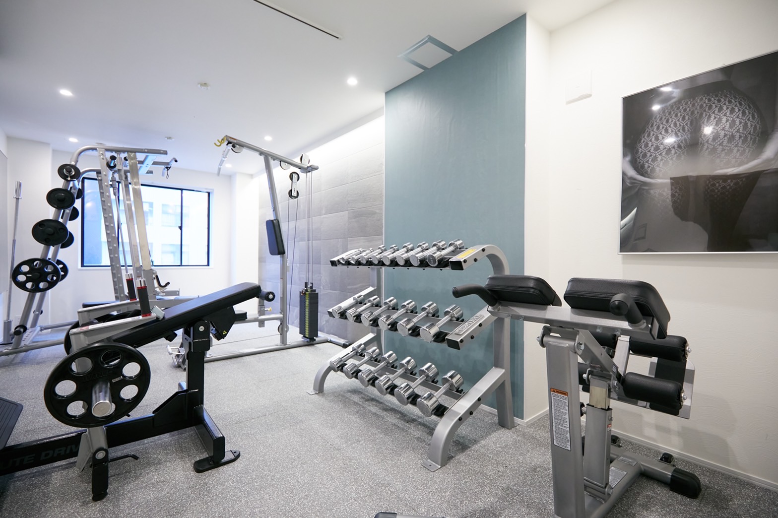 スミスマシン, インクラインベンチ, ケーブルマシン, ダンベル1~5kg, ヨガマット, ストレッチポール, チューブ類, セラバンド, ラットプルダウン、バックエクステンション、グルートドライブ エアコン, 音響設備