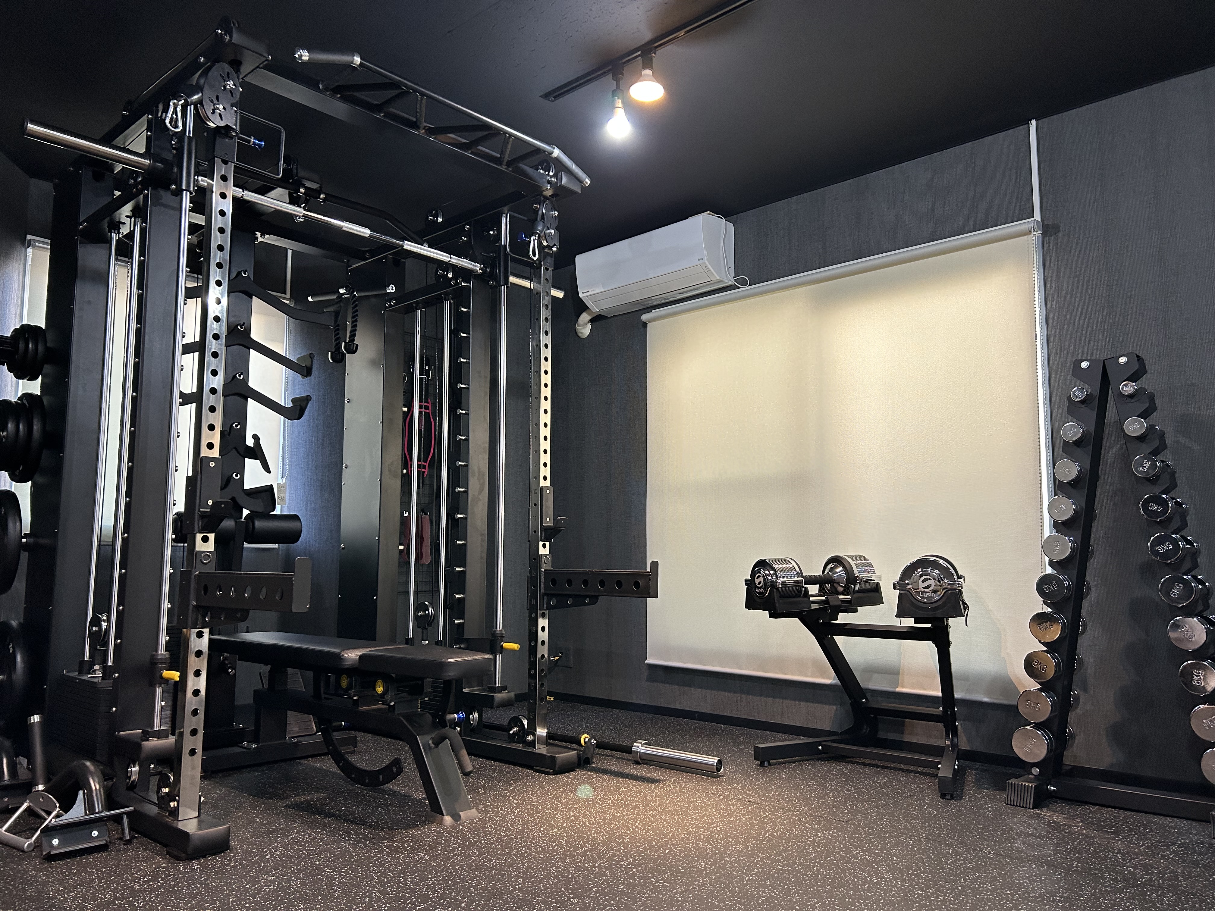 パワーラック, スミスマシン, オリンピックバー, インクラインベンチ, ケーブルマシン, 可変式ダンベル1kg刻み32kg×2, ダンベル1~10kg×2, ヨガマット, ストレッチポール, バランスボール, チューブ類, セラバンド, グローブ, マッサージベッド,マッサージボール, 腹筋ローラー 更衣室, ウォーターサーバー,水道, ゴミ箱, 室内シューズ, wifi, エアコン