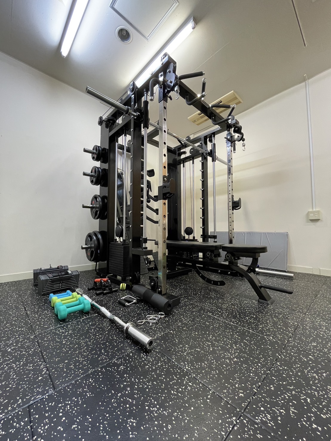 パワーラック, スミスマシン, オリンピックバー, イージーバー, インクラインベンチ, ケーブルマシン, 可変式ダンベル, ダンベル1~5kg, ヨガマット, ストレッチポール, チューブ類, セラバンド