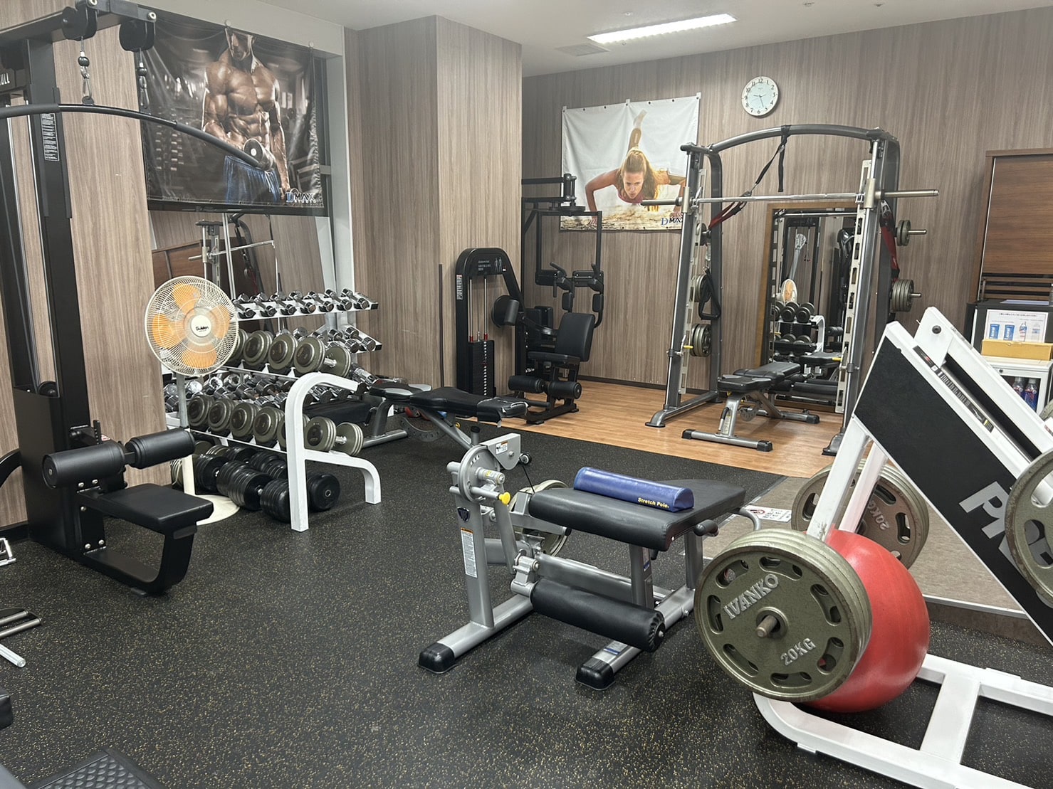 パワーラック, スミスマシン, オリンピックバー, イージーバー, インクラインベンチ, ケーブルマシン, ダンベル1~5kg, ヨガマット, ストレッチポール, バランスボール, セラバンド, ミット, ランニングマシン, マッサージベッド 更衣室, 体重計, ゴミ箱, エアコン