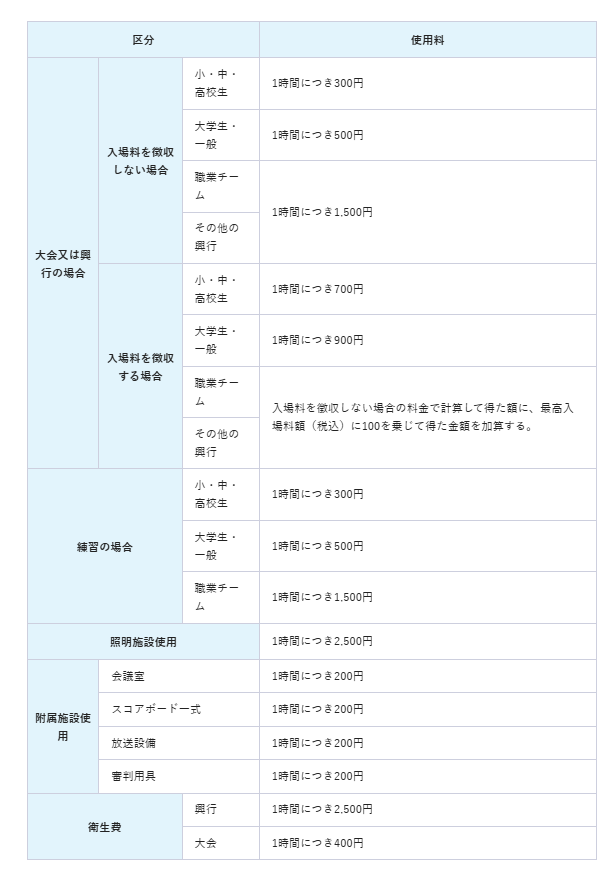 ◎使用するための準備及び原状回復に要する時間は、使用時間に含めるものとする。 ◎使用許可時間を超えて使用した場合は、その超過した時間(1時間未満は、1時間とみなす。)に応じ超過使用料を徴収する。 ◎この表に定めのない市民(本市に居住する者及び本市に事務所を有する団体をいう。)以外のものが使用する場合の使用料は、この表に定める使用料の100分の50に相当する金額を加算する。 |