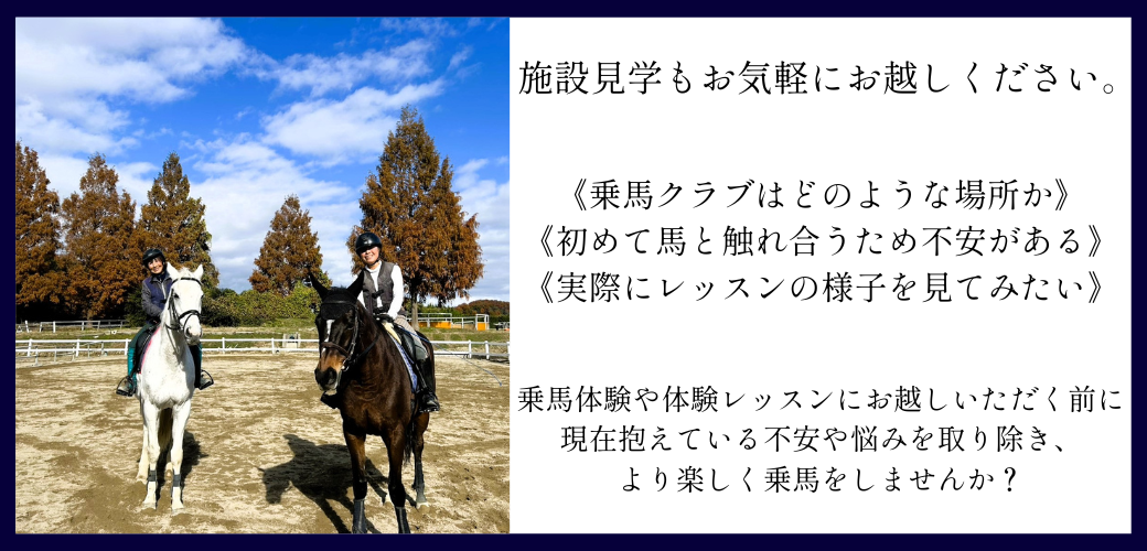 当クラブは様々な年代のお客様に親しまれ、全日本出場実績を持つ経験豊富な講師も在籍しており、初めて乗馬をされる方から競技志向の方まで、様々な方の乗馬ライフをサポートいたします!